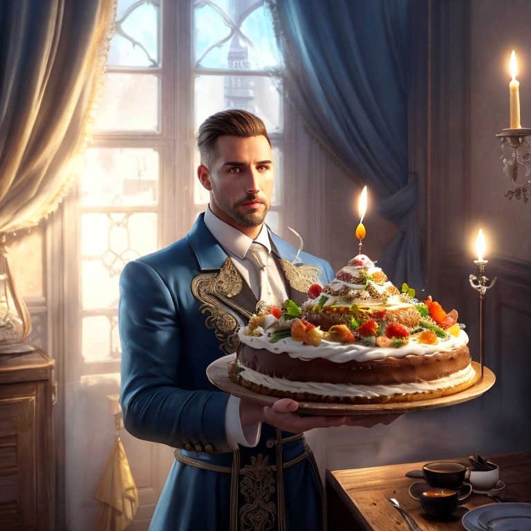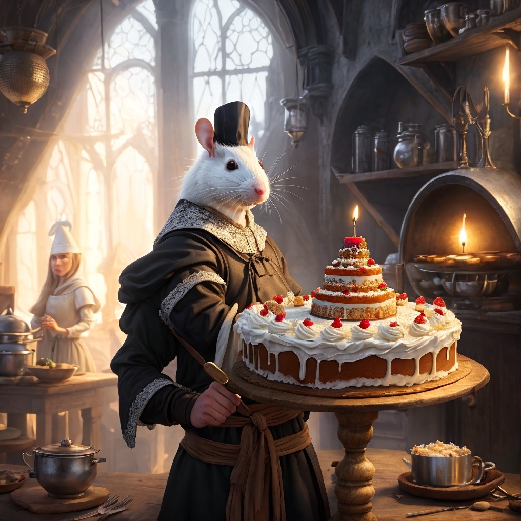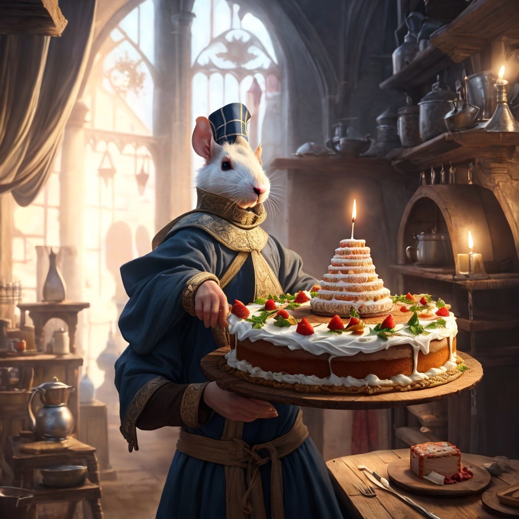 An anthropomorphic mouse in Victorian attire presents a birthday cake in an ornate, candlelit room with gothic architecture.