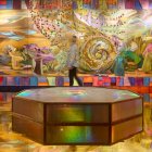 Vibrant Interior Space with Round Table and Mural