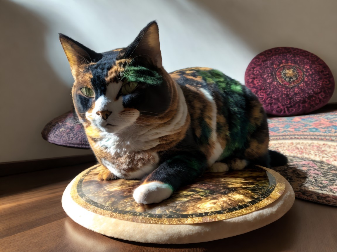 A plush cat figurine with a colorful, patterned coat rests on a vibrant, patterned cushion. The scene is cozy, featuring soft furniture and a warm, inviting atmosphere.