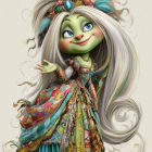A whimsical, green-skinned animated character with long, flowing white hair and a floral crown. She's dressed in a colorful, ornate gown adorned with flowers, exuding a playful charm.