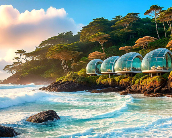Man in red cap with two dogs looks at futuristic farm equipment and spherical structures in a golden field with towers in the background.