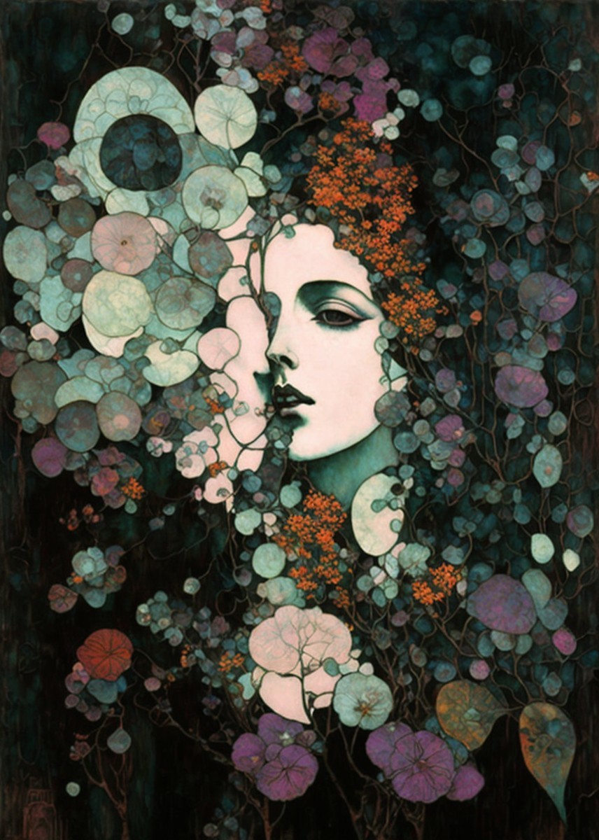 Patchwork pandemonium, portrait in plutonium, patina of ancient stone with moss, art brut, moody, somber, desaturated colors, in the style of Paul Klee, Banksy, Arthur Rackham, Prompt by KRW