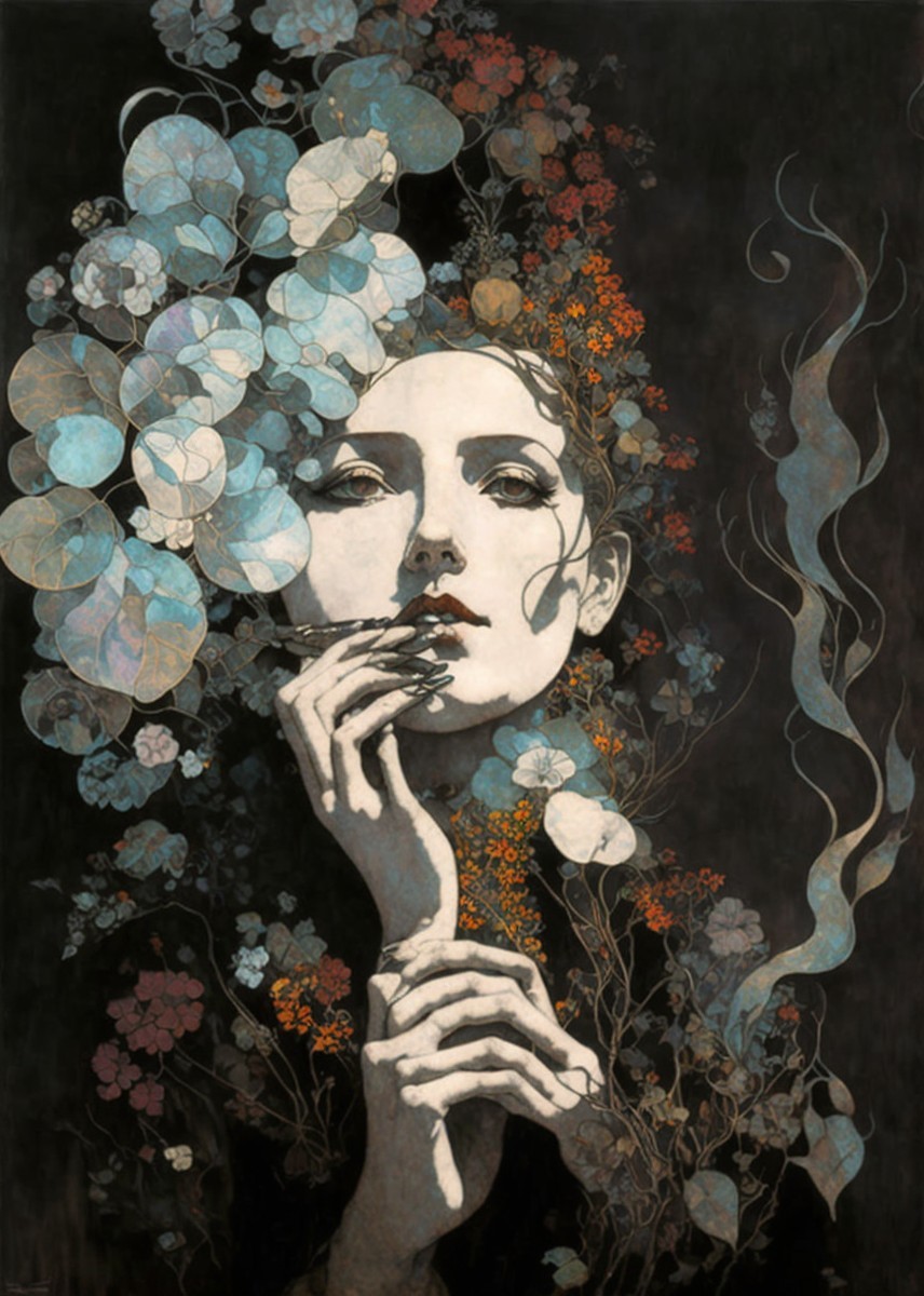 + Prompt:But wasn't it beautiful? Didn't we forget about the sad times for a while? smoke and gossamer, nostalgia, art brut, moody, somber, desaturated colors, in the style of Paul Klee, Arthur Rackham, Alphonse Mucha