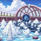A serene, fantastical landscape depicting a tranquil pond surrounded by enchanting ice formations. The pond is filled with whimsical icebergs, resembling mountains, while delicate glass structures and bowls float gracefully on the surface. In the background, a beautifully arched architectural feature frames a view of swirling blue waters. The sky is a vibrant blue with fluffy white clouds, and lush green grass peeks over the edges, adding a touch of life to the icy scene. The overall atmosphere is dreamy and magical, evoking a sense of wonder and tranquility.