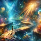 A dreamlike scene features a girl in a blue dress standing by a shimmering water pool, surrounded by vibrant, oversized mushrooms and ethereal glowing lights in a mystical forest.