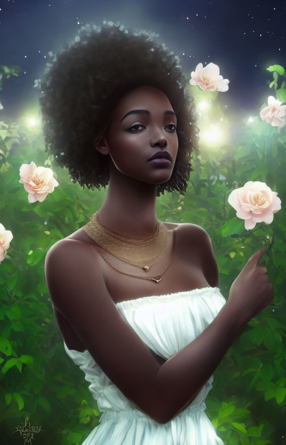 Prompt: A beautiful African-American fairy Maiden with beautiful symmetrical eyes, with very long hair with an amber necklace, shrouded in mystical radiance, against a starry sky, concept art with 16k resolution, intricate, fantasy, author: Alphonse Mucha, VLOP, Anna Dittmann, photorealistic