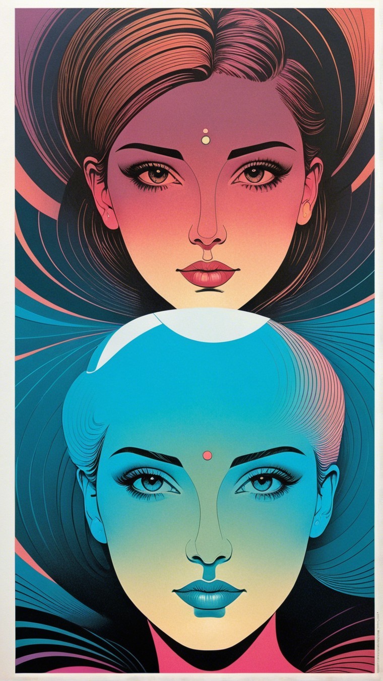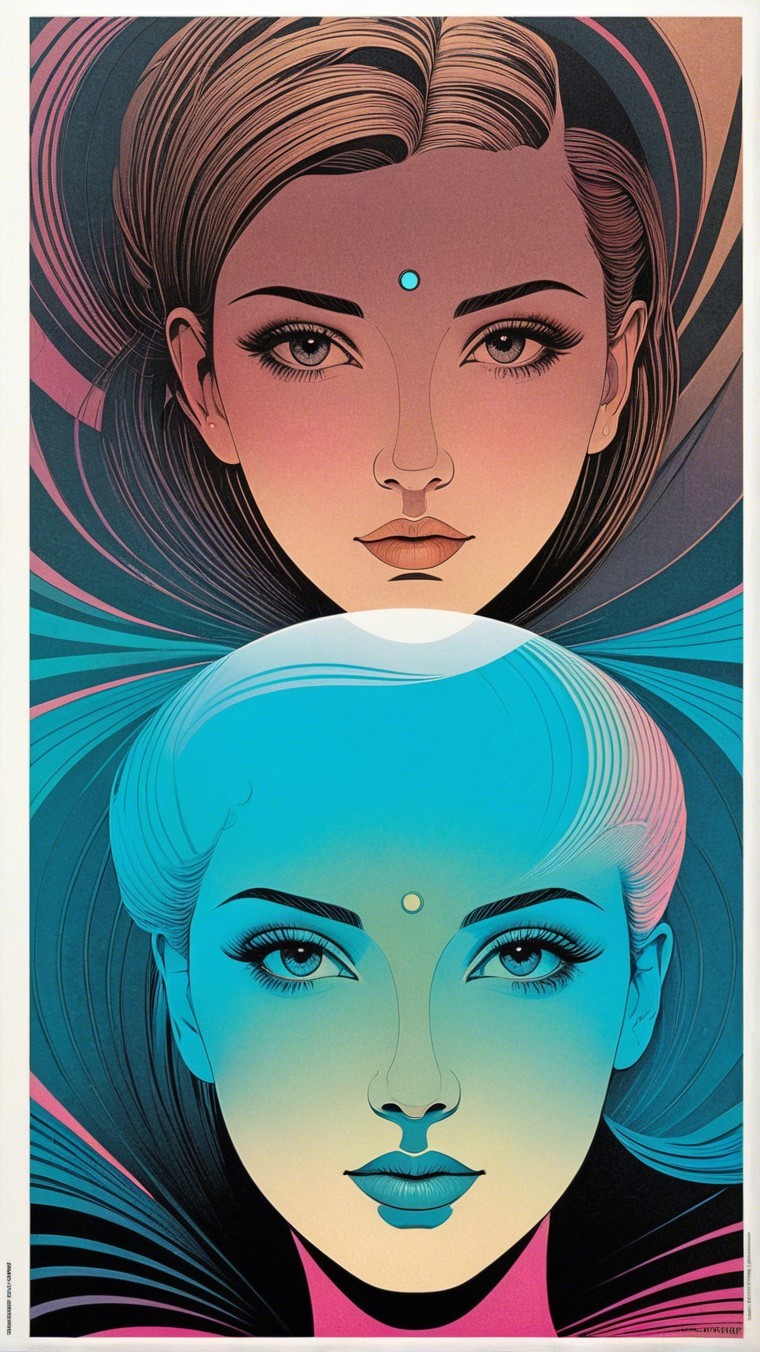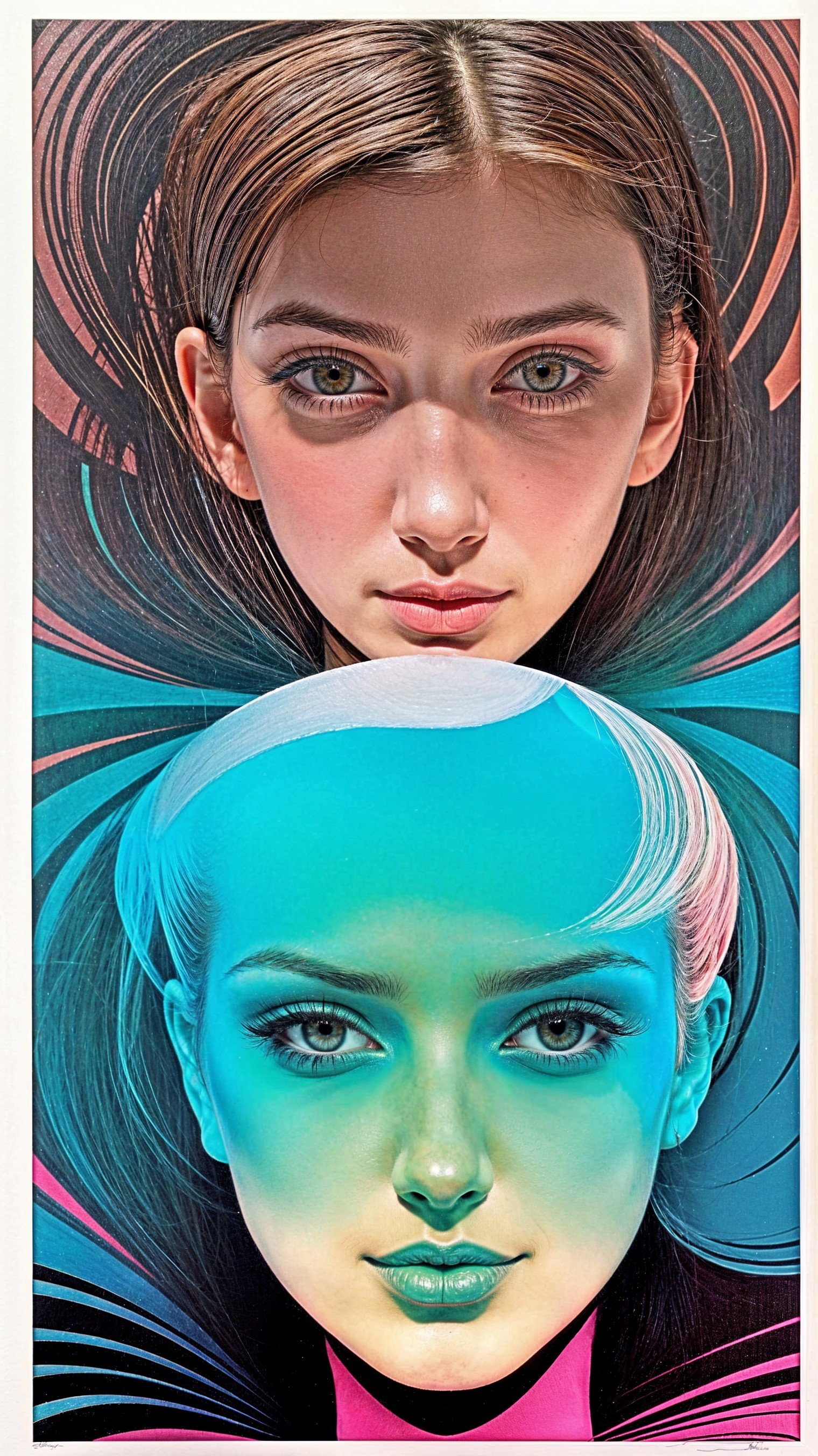 + Prompt:Line-art, surreal style of Darren Waterston, stylized female portrait, retrofuturistic collagraphy print, geometrical linocut style, gradient coloring, contigous abstracted line-art, ultra fine textures, slightly warped, catenaries, vortexes, swirls, mandelbrot fractals, only curves, perpendicular streamline_moderne, 3d effects, raytraced shadows, texture mapping, evocative, sumptuous, shadow mapping, displacement mapping, concept art by Buckminster Fuller and Stan Lee, harsh, gradient coloring, overlay, layered vector art, folk-art, ambitious Shipibo-Conibo patterns merged with zentangle linework, female headshot in style of Felix Colgrave and Frank Miller and Man Ray, line-art, openly, frankly, overtly, candidly, plainly, sincere elements of Post-Avantgarde and pointillism, layered geometrical surrealism, intricate pen and ink details, fusion of Gediminas Pranckevicius, hues by Ho baron and Kate Beaton, tints by Man ray and Deborah Azzopardi,lighting by Arlie Opal and Laura Callaghan styles, mip-mapping effects, luminism, futuristic, abstracted, figurative, layered, unique texture mapping 1.8, detoriated background, retrofuturism, fallout video game movie still, simplistic coloring scheme, joyful, exuding,zentangle-inspired linework, color glitch elements, sci-fi undertones, pulp art infusion with opalescent linework, juminocore aesthetic, exaggerated facial features, liminal setting, vibrant and diverse color palette, dynamic lighting to enhance the stylized details.abstracted embodiment, visible porcelain skin texture, displacement mapping, plasmatic hatchings, scratched edges, cel-shaded lighting is soft and diffused, highlighting the delicate features and fabric textures. 3d effects, layered shapes, raytraced shadows 1.4, crayon art reminiscence, hdr, uhd, contouring outlines, subsurface scattering 1.6, pointillism theme, Ho Baron inspired, overflowing with visual density, trippy, warm-toned, very colorful,plasticity 1.9, brightness 1.3, zentangle, swirls, cymatics,liminal pointillism silhouette, made with pen and ink, chiaroscuro background, crackled paper, simple embodiment, minimalistic abstract featuers, asymmentrical line art weaves a whimsical and psychedelic ambiance. Comic book art style merged with american gothic. Blotted, stippled, tesselated. Flourescent color shapes, parallax occlusion 1.5. hues by William Bradley, subsurface scattering 1.2, quaint, mip-mapping 1.3, displacement contoured, warm purple tones, cubistic-inspired background, catenaries, organic textures by Ed Binkley and Frank Frazetta, supernatural asymmetry, unsettling, painterly effects, visible porcelain skin texture, gravy, wavery texture patchwork, pellucid details, opaque elements, 128k rendering, estranged metallic paints, dappled glow, line-art concept, whimsical retro fusion, Riemann's geometrical spheres, vibrant red and black, brightened colors, impossible light transitions, luminism, futuristic, abstracted, figurative, layered, unique texture mapping 1.8, detoriated background, retrofuturism, fallout video game movie still, simplistic coloring scheme, joyful, exuding, splash art, sassy hues by Lawrence Schwinger, displacement mapping 1.6,
