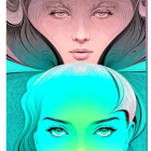 The image features two stylized female faces, one pink-toned and the other blue-toned, with flowing hair and captivating expressions. The contrasting colors create a striking visual effect.