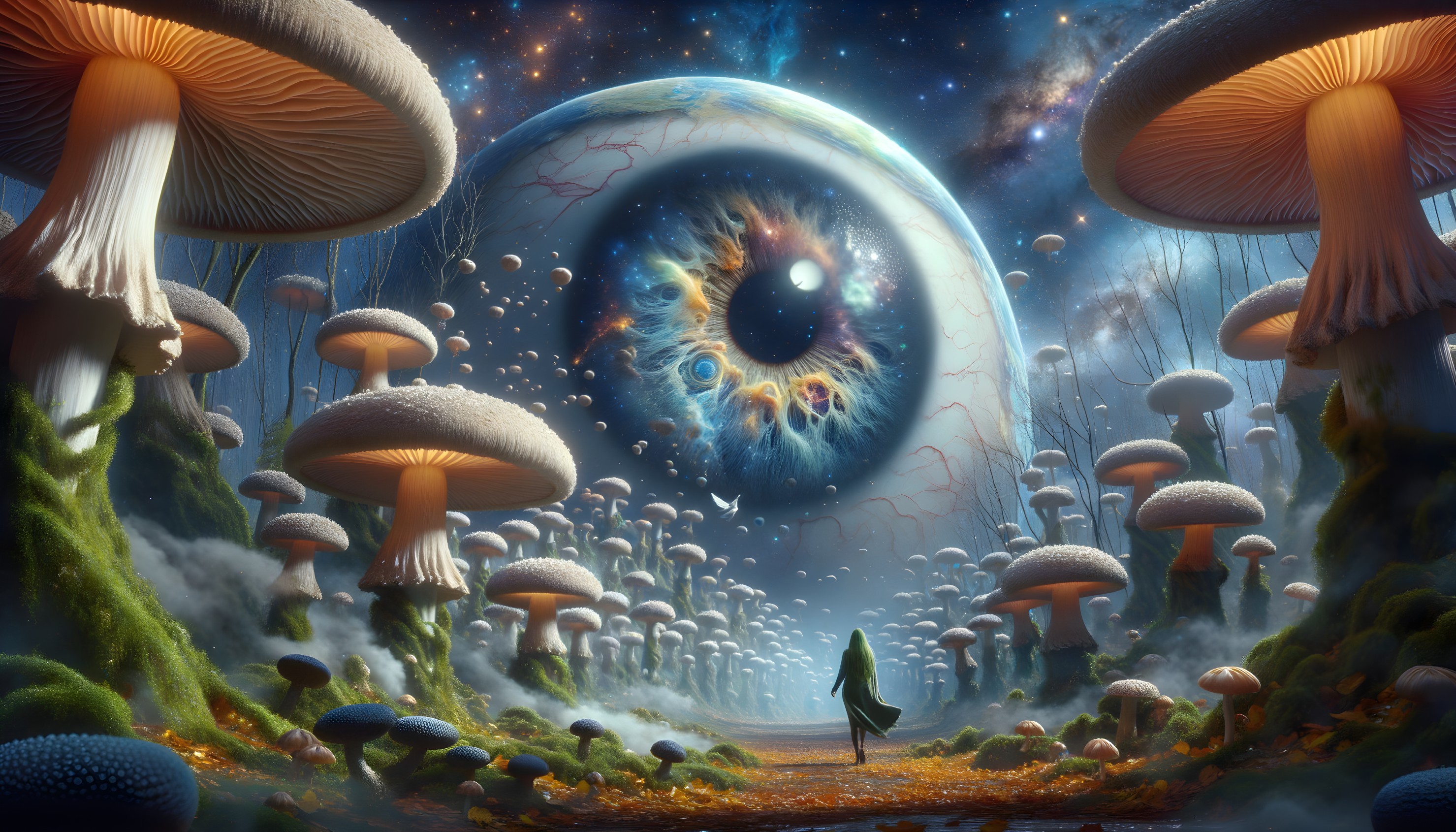 A figure stands amidst giant mushrooms under a starry sky, facing an enormous, detailed eye that looms above the surreal landscape.