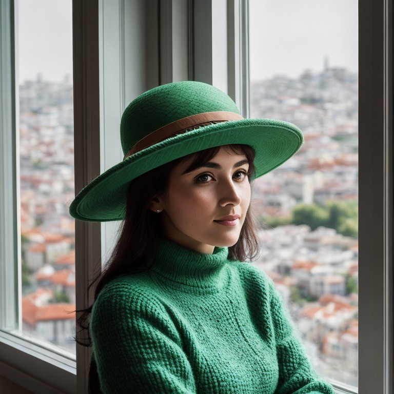A woman in a green hat and sweater poses by a window overlooking a cityscape with overcast skies.