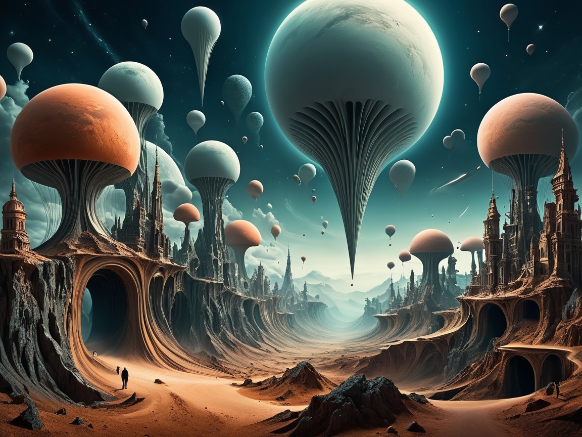 A surreal landscape features towering rock formations and fantastical architecture under a sky filled with vibrant balloons and giant planets, creating a dreamlike, otherworldly atmosphere.