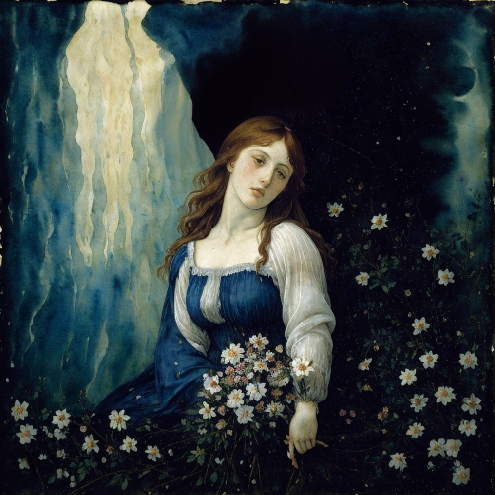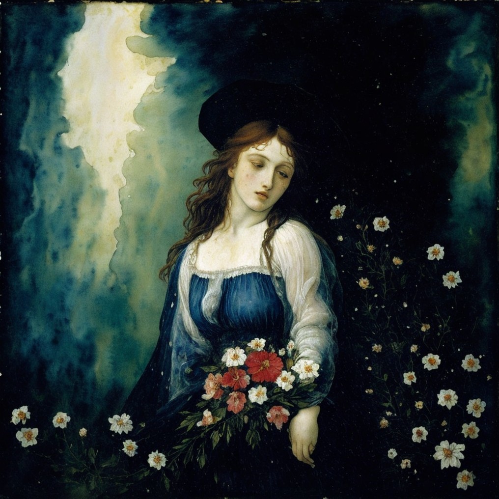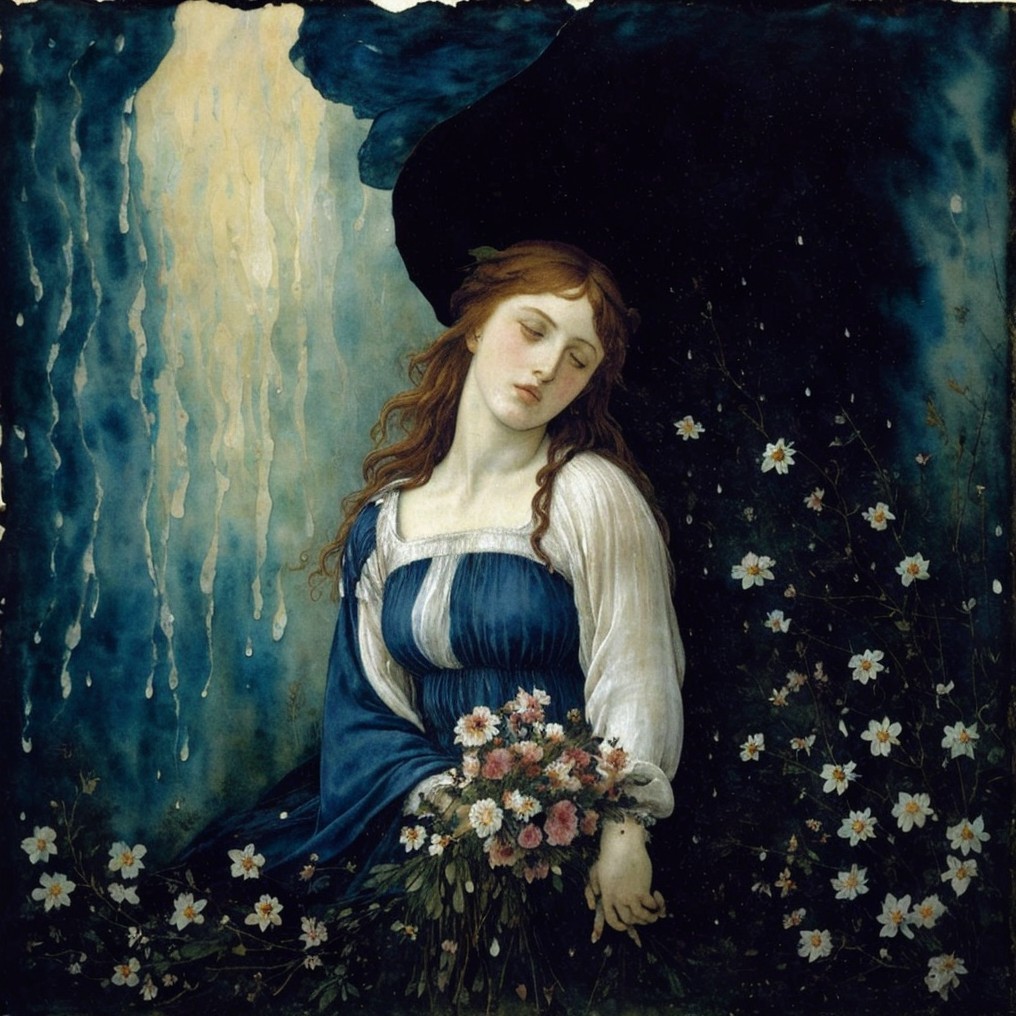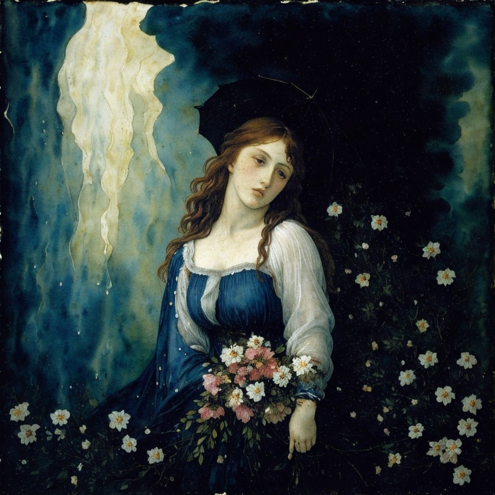 The image features a melancholic woman in a blue and white dress, holding a bouquet of flowers. Her expression is wistful, set against a dark background with soft, flowing water and delicate blooms.