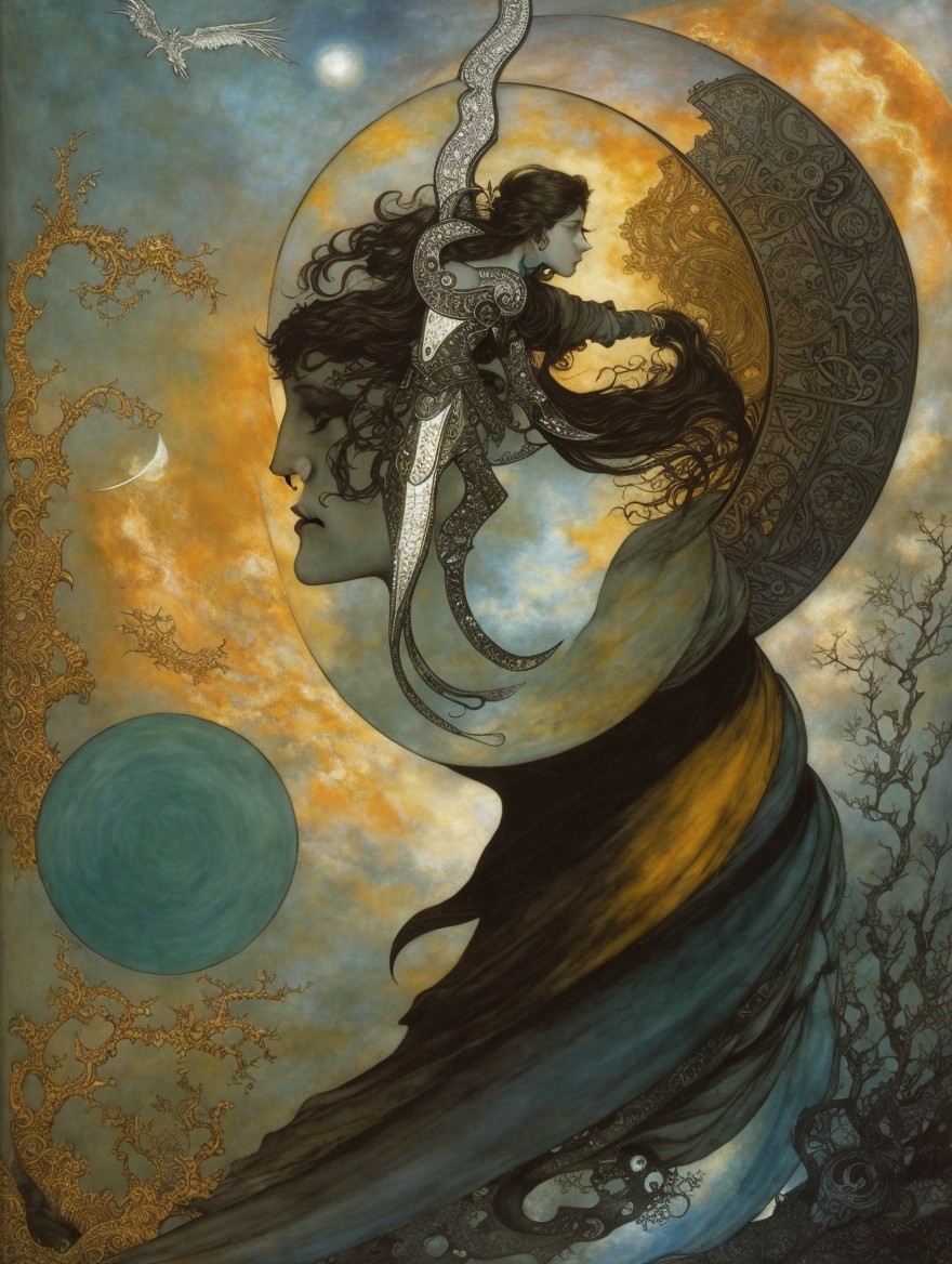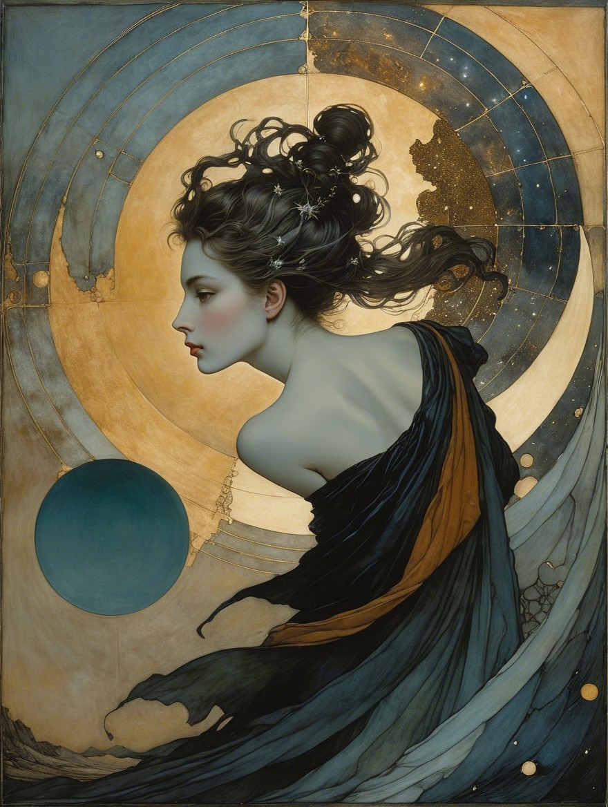 A graceful woman in a flowing blue dress stands by the sea, her long hair cascading down. She’s reaching towards a large, luminous celestial backdrop, surrounded by swirling clouds and waves.