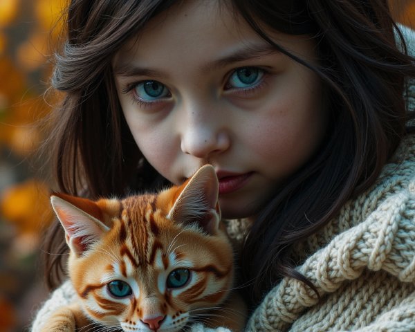 A young girl with long dark hair holds a small orange tabby cat close to her chest. Their striking blue eyes capture the warm autumn backdrop of golden leaves. Both look serene and connected.