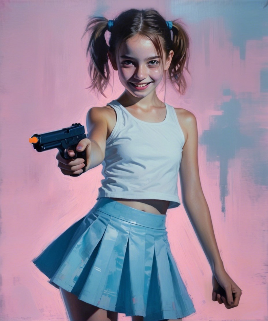 Young girl in playful pose with toy gun and pink background