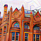 The image features a vibrant, abstract representation of a historic building with intricate architectural details. Bold colors and a dynamic texture create a lively, artistic effect.