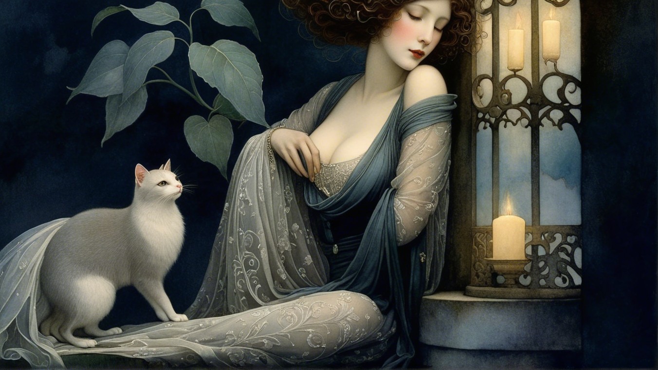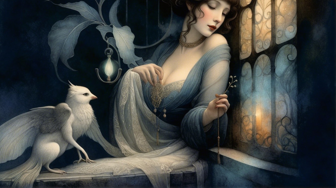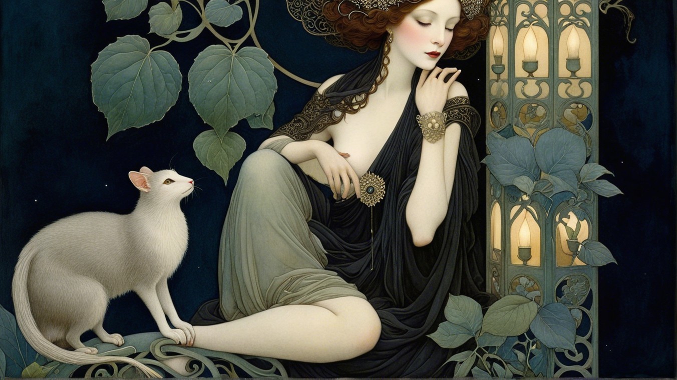 A serene woman with vibrant red hair sits elegantly, adorned in a black and green gown, beside a white bird, framed by lush leaves and softly glowing candles. The atmosphere is enchanting and mystical.