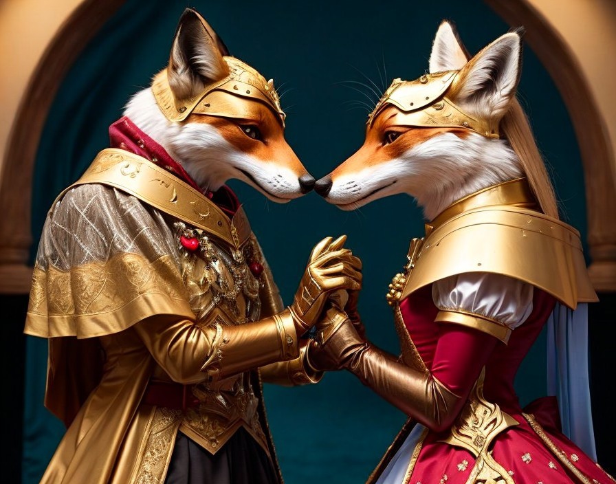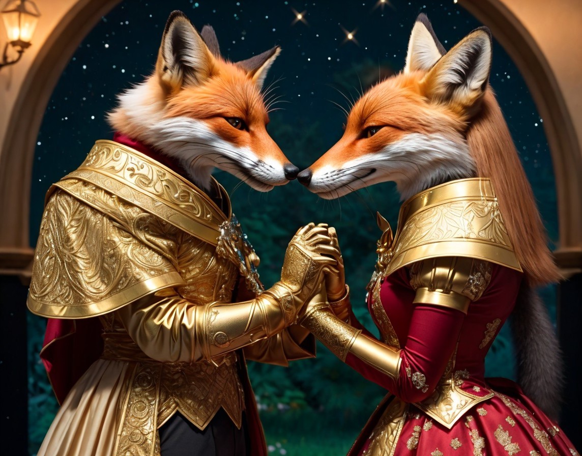 Two anthropomorphic foxes in regal attire hold hands under a starlit archway, conveying a sense of nobility and romance.