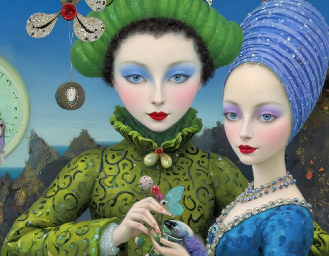 The image features two ethereal women in elaborate, vivid costumes with bold colors and ornate accessories, set against a fantastical backdrop of lush greenery and rolling hills.