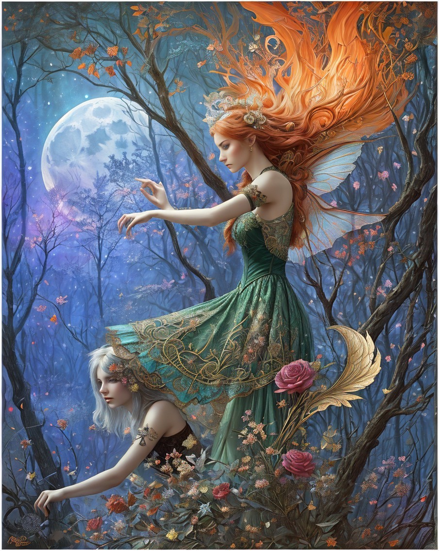 + Prompt:Anaglyph, Beautiful fire moonlight forest fairy , style by Aleksi Briclot, tom bashaw and catrin welz-stein, surreal dream. Extremely detailed, intricate, beautiful, high definition.