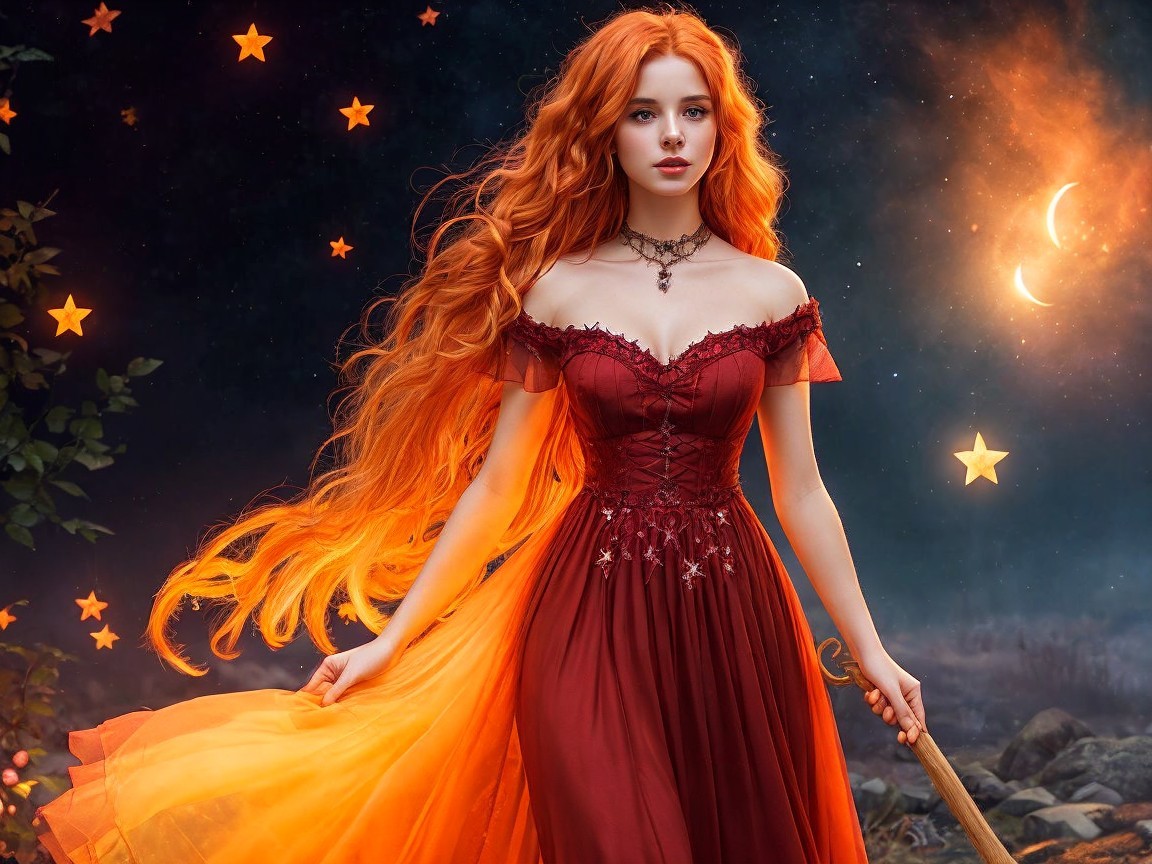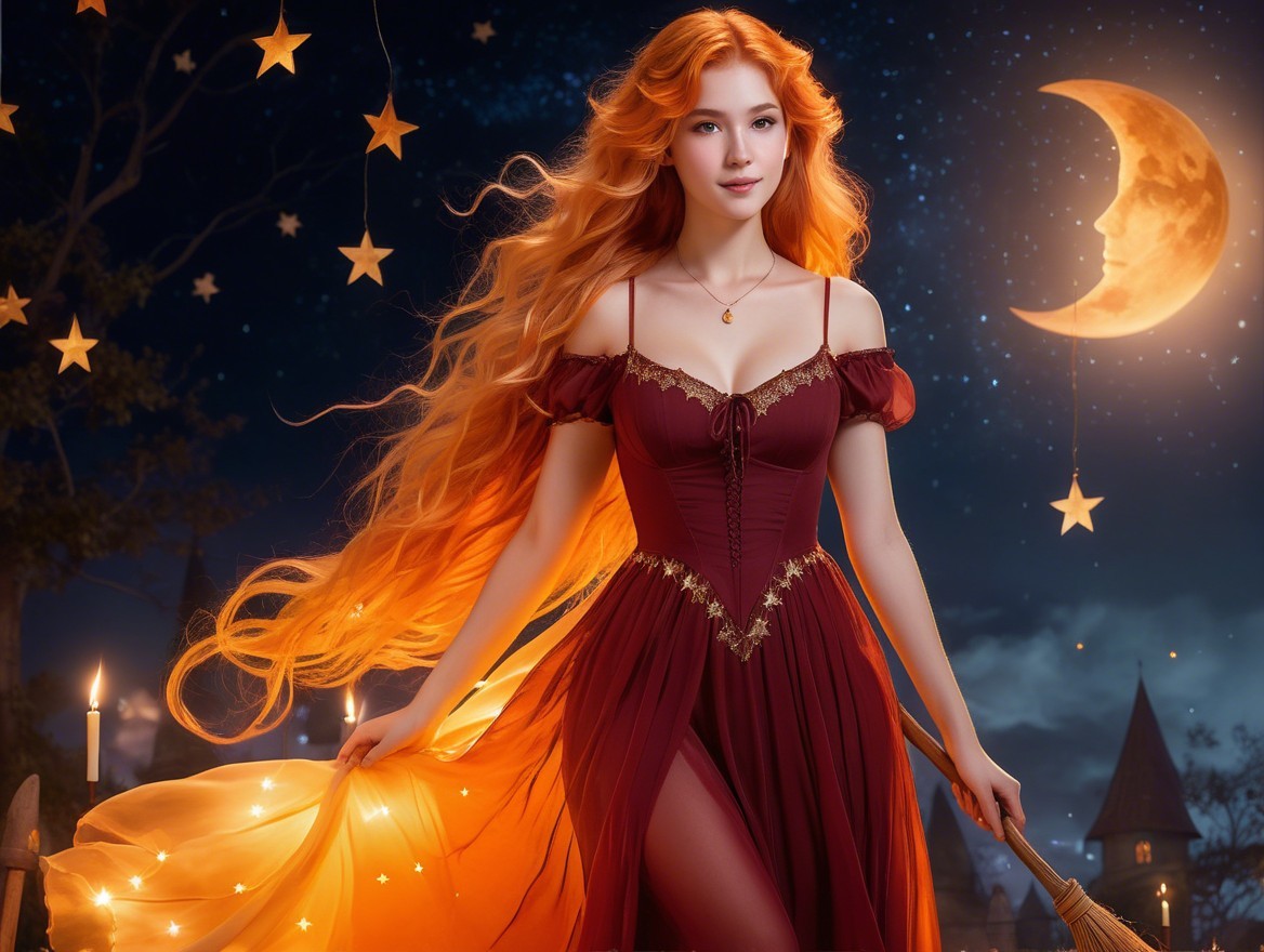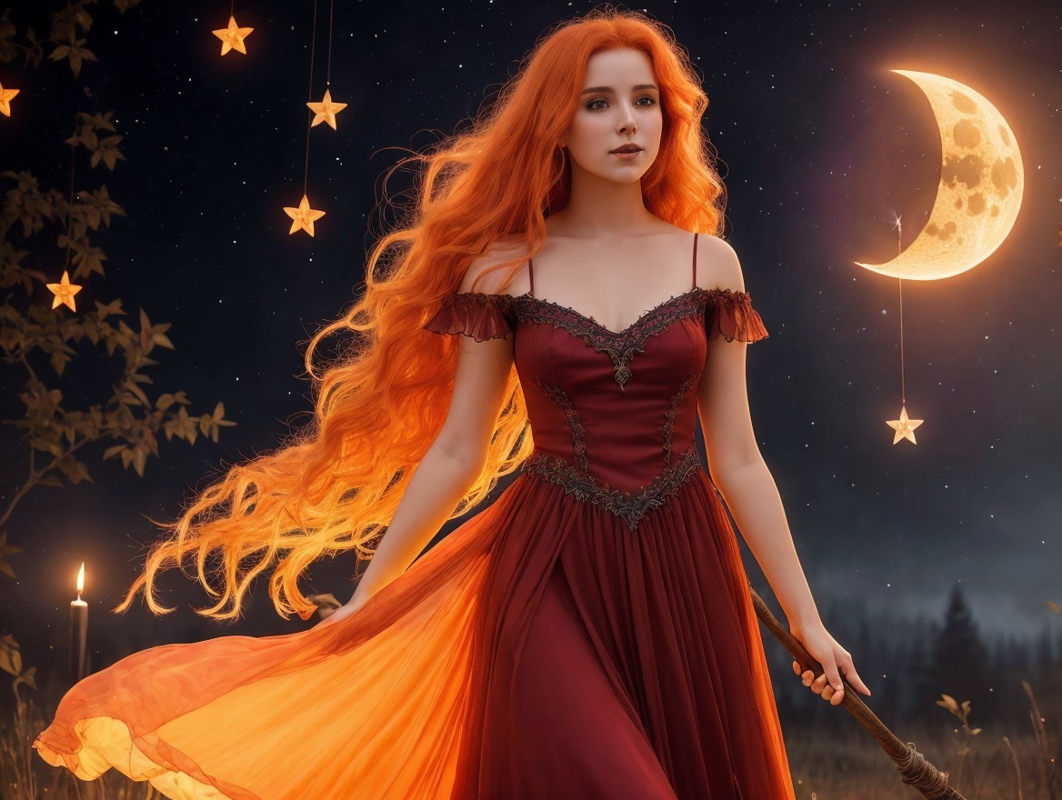 Prompt: "Fiery-haired young woman, 18 years old, ethereal chiffon dress, deep neckline, witch attire, night scene, witches' gathering, riding broom, joyful expression, stars twinkling, visible sickle moon, mystical ambiance, red and blonde hair, transparent fabric, enchanting setting, dark background, magical atmosphere, fantasy illustration, detailed focus, warm and mystical lighting, Artstation."