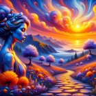 A surreal landscape features a majestic blue figure set against a vibrant sunset. Colorful trees and swirling clouds enhance the dreamlike atmosphere, creating a harmonious blend of nature and fantasy.