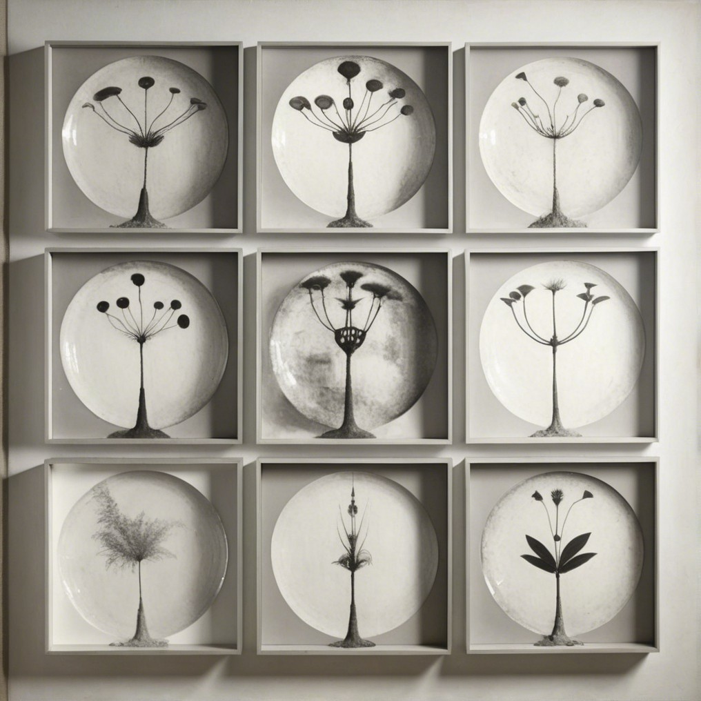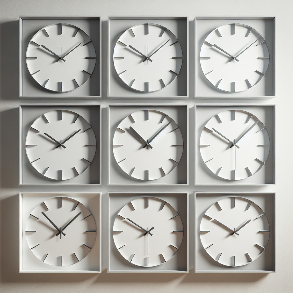 The image features a grid of nine antique-style clocks, each with unique designs and colors. Some have floral motifs, while one clock has a missing center, creating an eclectic visual effect.