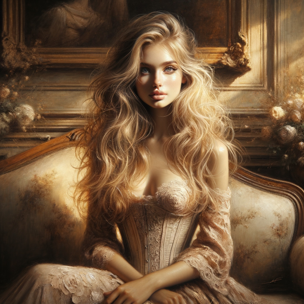 A young woman with long, flowing blonde hair sits gracefully on a vintage couch, dressed in a delicate corset. Soft light highlights her serene expression in an ornate, elegant interior.