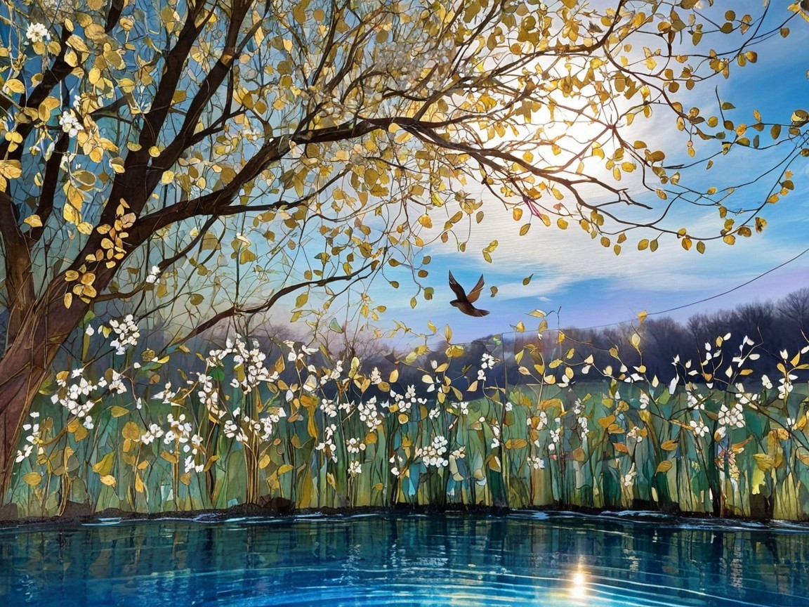 A serene landscape featuring a tranquil river reflecting blues and greens. Overhanging branches and vibrant foliage frame the scene, while a lone bird soars above the shimmering water.