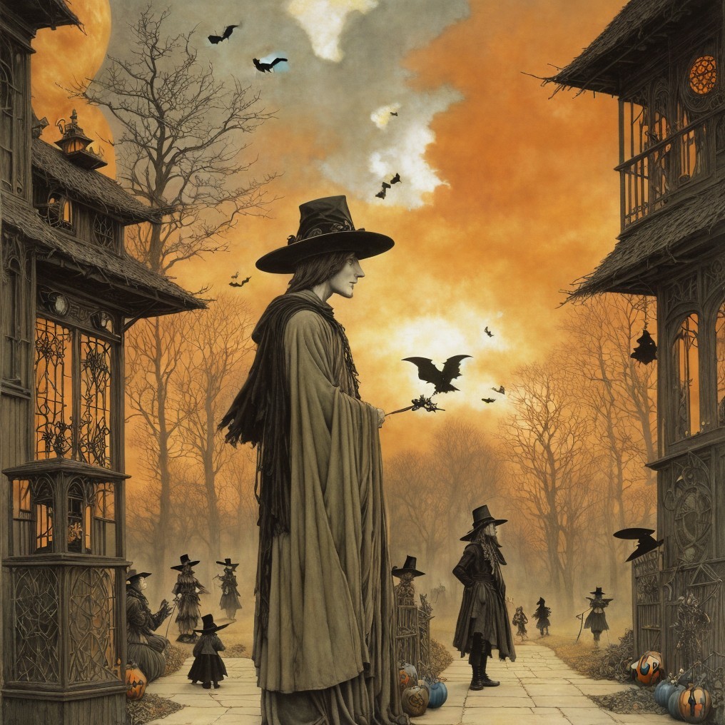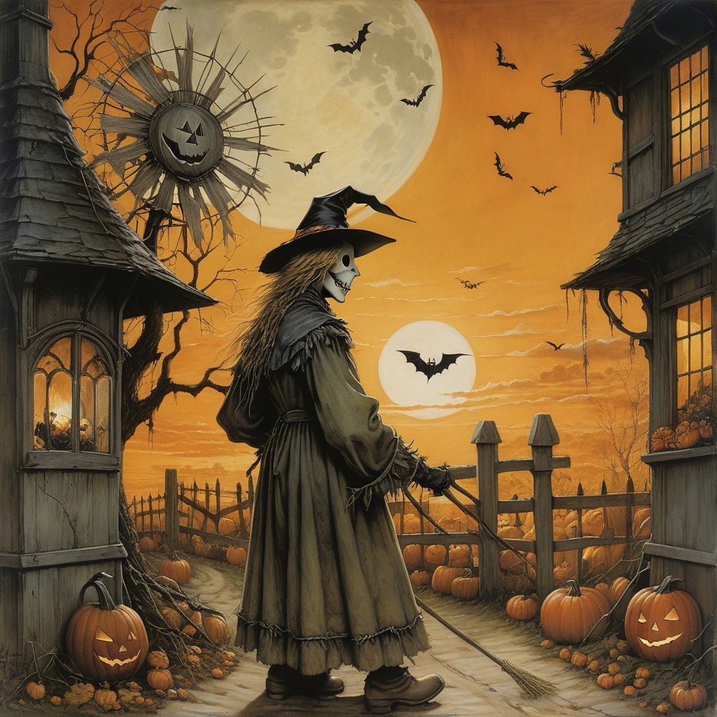 A spooky scene depicting a skeletal witch in a dark outfit, standing amidst a pumpkin patch under a large glowing moon. Bats fly overhead, adding to the eerie Halloween atmosphere.