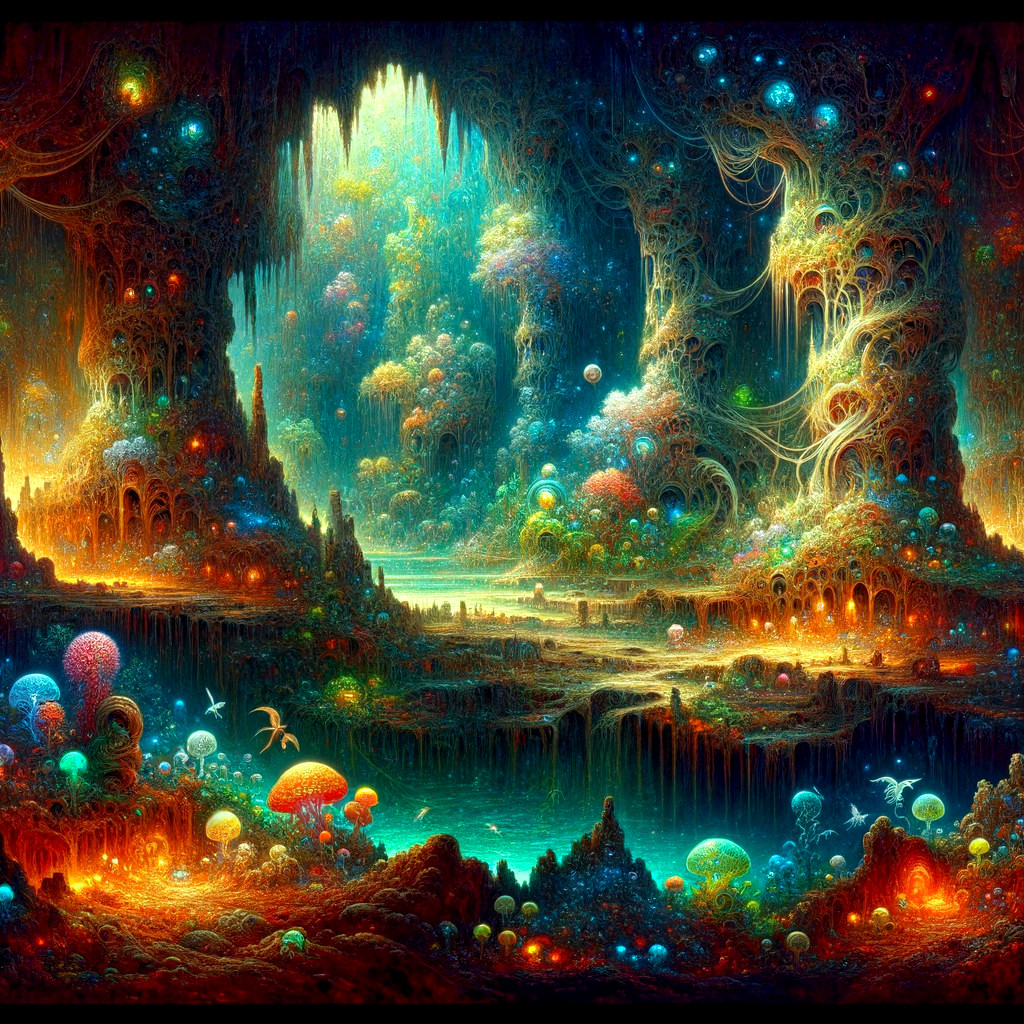 A vibrant, fantastical landscape with luminous flora, cascading waterfalls, and intricate, glowing structures, evoking a sense of otherworldly wonder.