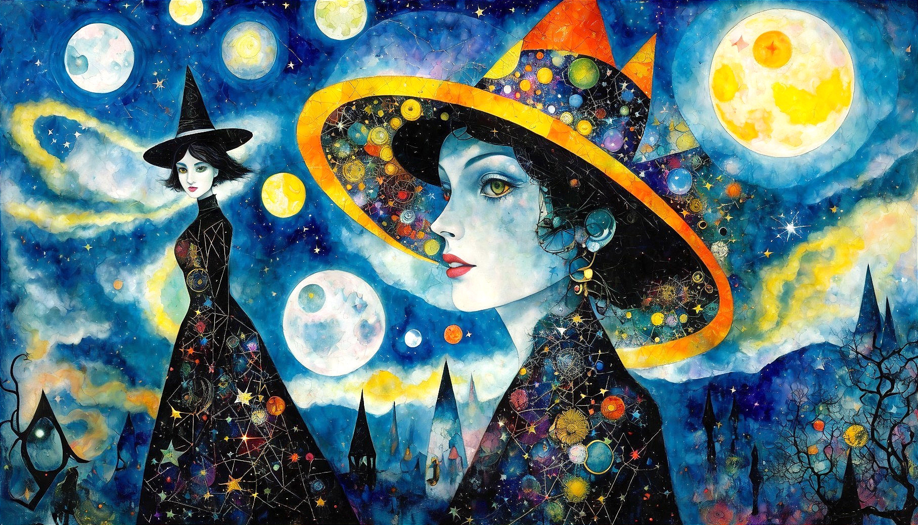A surreal painting of two witches with celestial-themed attire against a night sky backdrop with moons, stars, and castles. Harvest in 9 months.