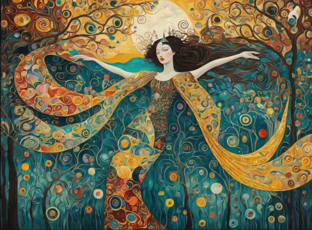 A mystical figure adorned in golden patterns dances amid an enchanting landscape, surrounded by swirling shapes, vibrant colors, and ethereal creatures, embodying harmony and nature's beauty.