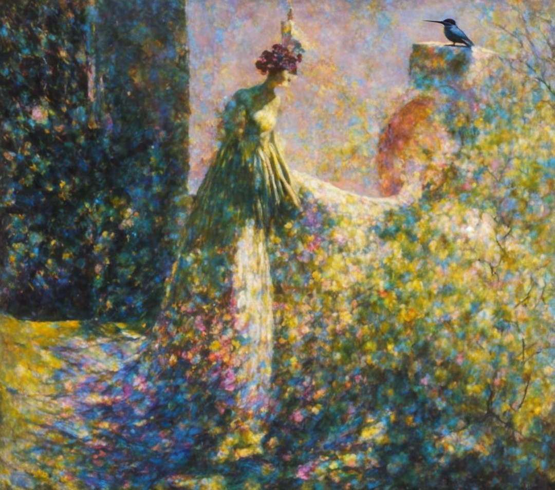 A serene figure in a flowing dress stands by a blossoming tree, captivated by a vibrant red bird. The scene is illuminated by a soft, warm light, evoking a sense of tranquility and wonder.