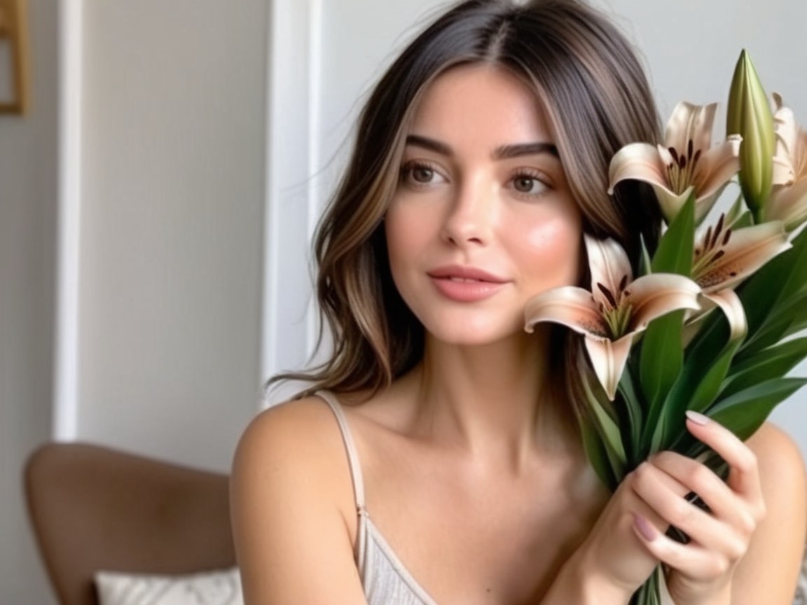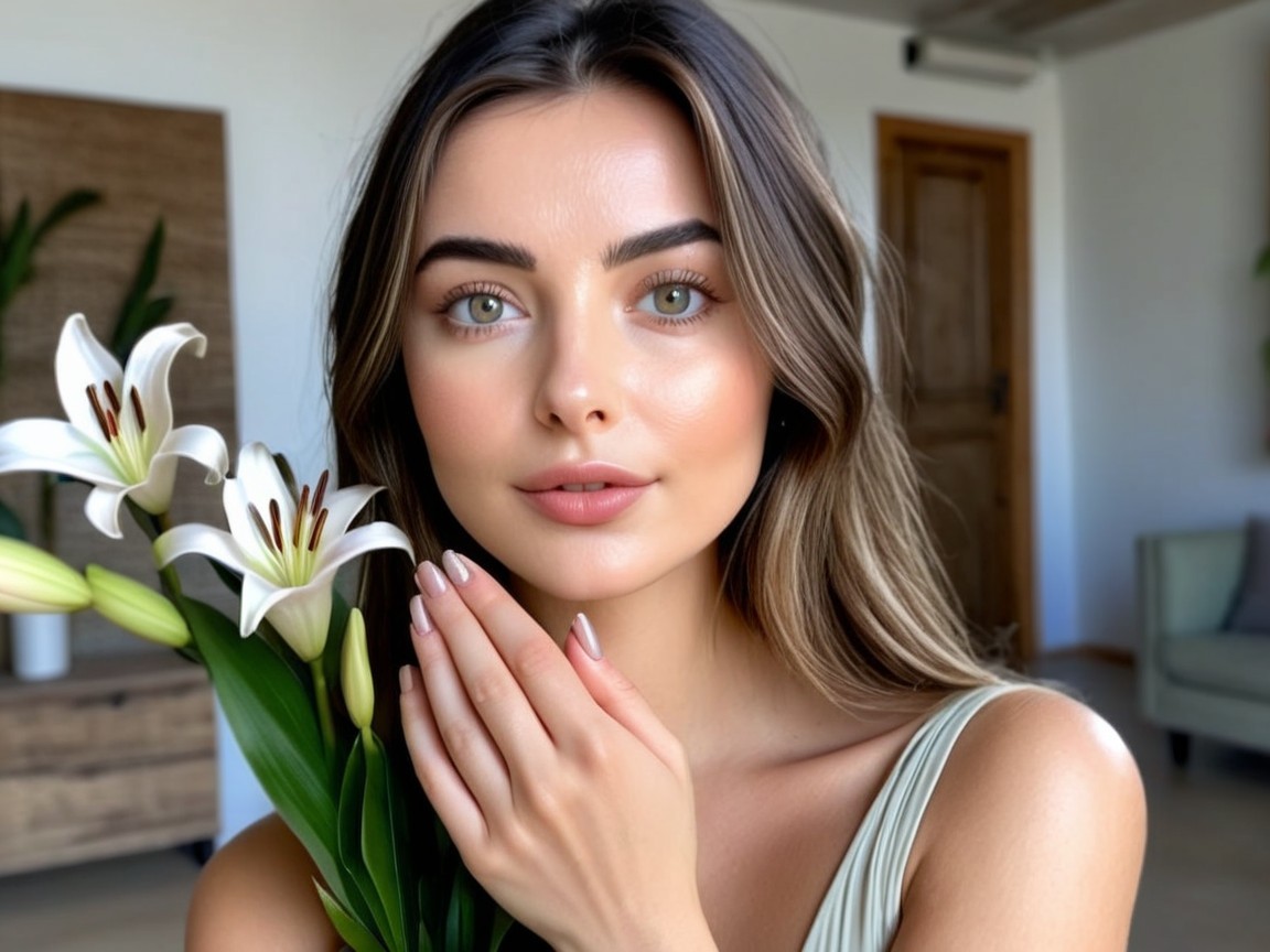 A smiling woman with vibrant green eyes and soft makeup poses with a pink lily, framed by lush greenery, exuding a fresh and radiant beauty.