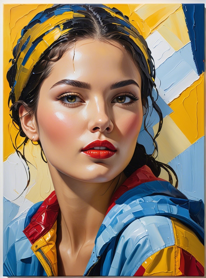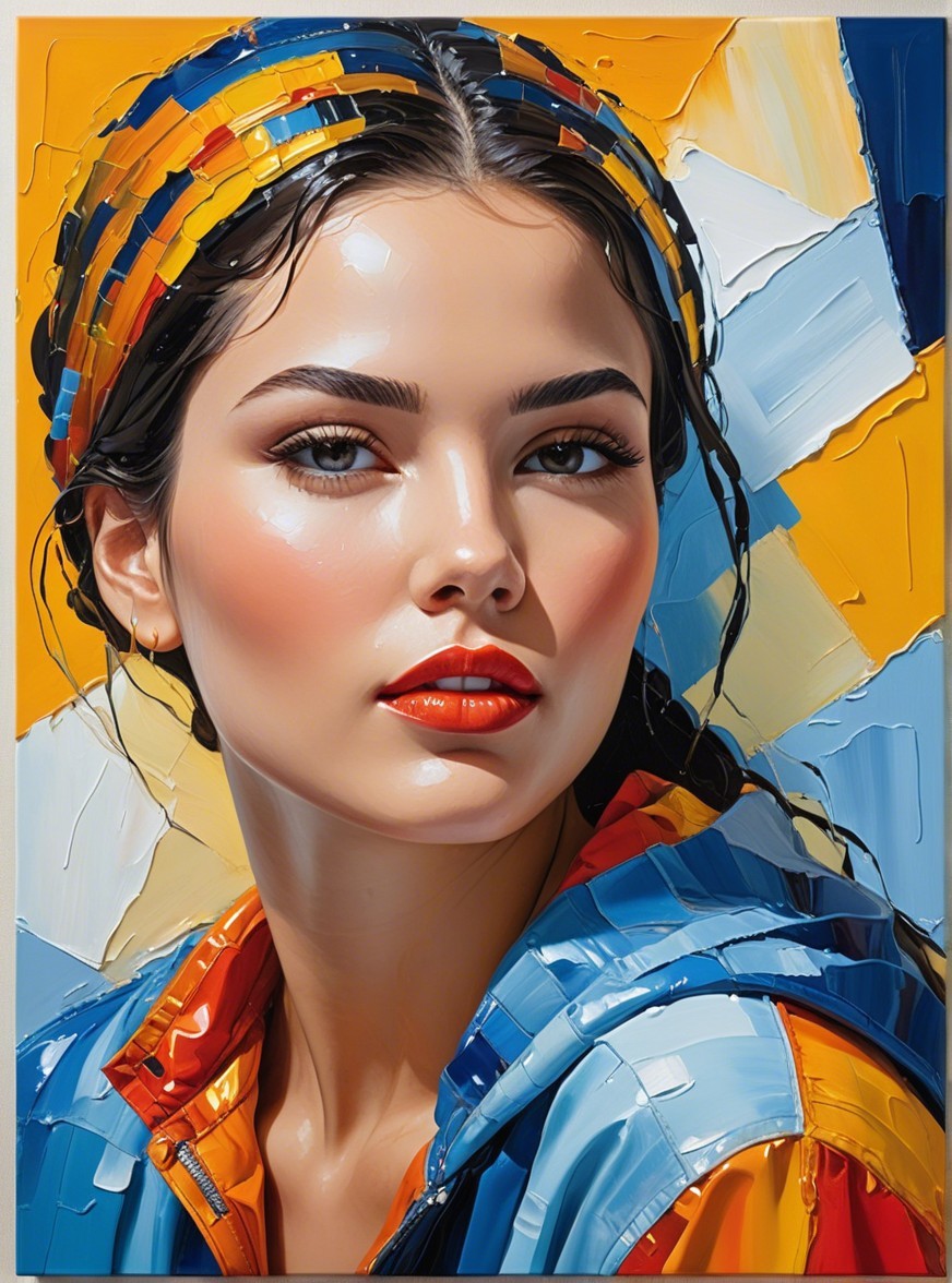 + Prompt:A mesmerizing wet-on-wet painting with intricate linework and layered stylized patchwork, featuring a headshot of a woman. This captivating oil painting on canvas features a vivid impasto style, characterized by bold, large brush strokes that add depth and texture, beauty surrounding colours, thick brushstrokes vividly lineage of deep blues, swirling yellows, and hints of burnt orange, irregular, impending storm, solitude, emphasizing lilghting and hues, fractalised painting, solitude, resilience, mood, simplicity, and nature's voluptous beauty.The artwork exudes a plasticity that blends beautifully with a tessellated design, creating a stylized lineage illustration. The piece incorporates gouache details reminiscent of Gwen John's style, with a gothical twist and 3D effects for added depth. The portrait is darkened, set against a textured background. Precise gelsculpt 64k, cel-shaded, unique, quilling, dyed, subsurface scattering, parllax occlusion 1.2, dof bokeh, debeh, impossible light transitions, quivering, reminiscent of American Gothic art but with a unique stylized fractalization, use of golden oil paint adds a shiny texture, enhanced by tiny black outlines. An elegant girl is portrayed amidst color spaces, creating a mixed media masterpiece with thinned paint and a rough wall texture. The overall aesthetic is ornamental, shiny, beautiful, enchanting, and ethereal, evoking a dreamscape feel. The artwork is further elevated by mesmerizing splash ink details, leaning towards abstract pop surrealism, showcased in a frontal view with stacked lines, triadic color scheme of brown, orange, and yellow