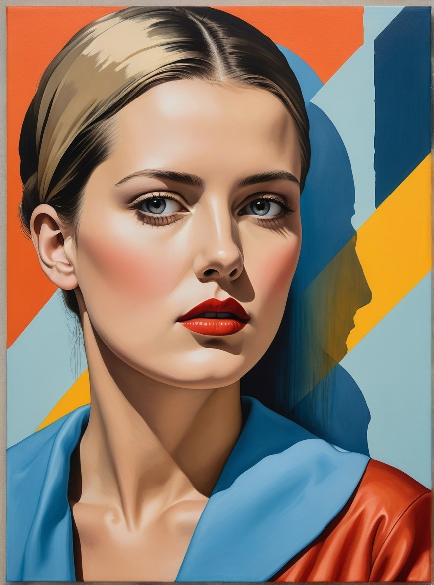 The image features a stylized portrait of a woman with striking blue eyes, red lips, and a headband. Bold geometric colors and shadows enhance her vibrant expression and modern aesthetic.