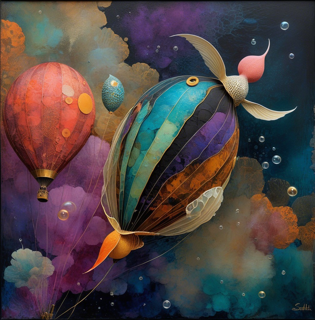 A whimsical scene depicts colorful hot air balloons floating amidst bubbles, while vibrant fish swim gracefully, creating a surreal underwater atmosphere filled with enchantment.