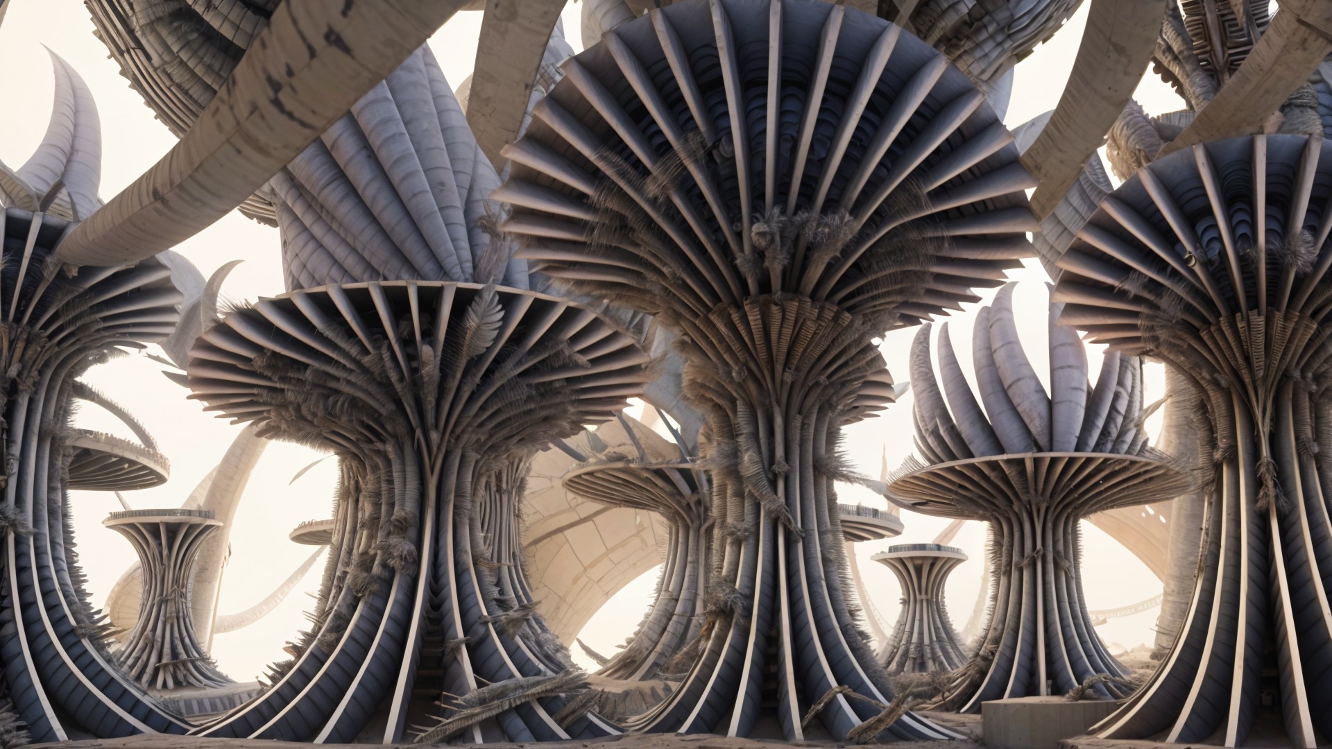 The image depicts a surreal landscape filled with towering, futuristic tree-like structures, featuring intricate designs and a soft, warm lighting that suggests an otherworldly atmosphere.