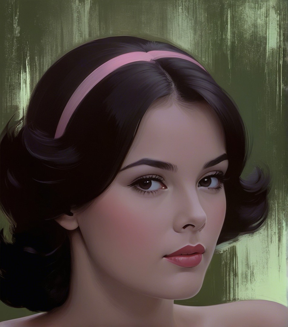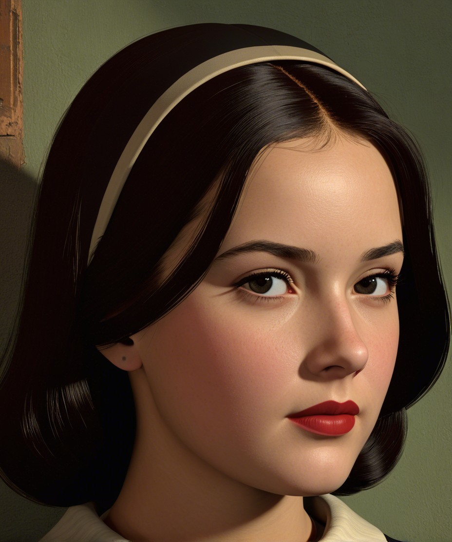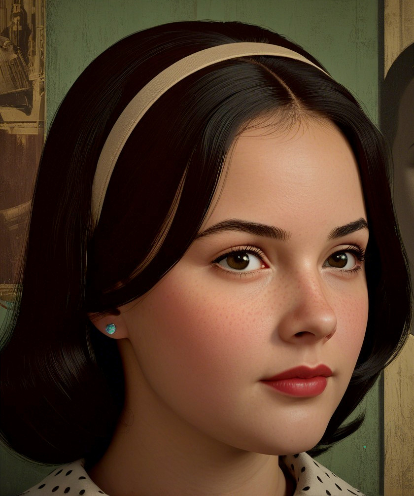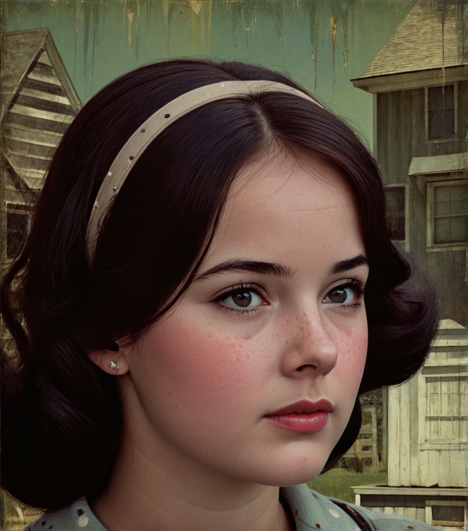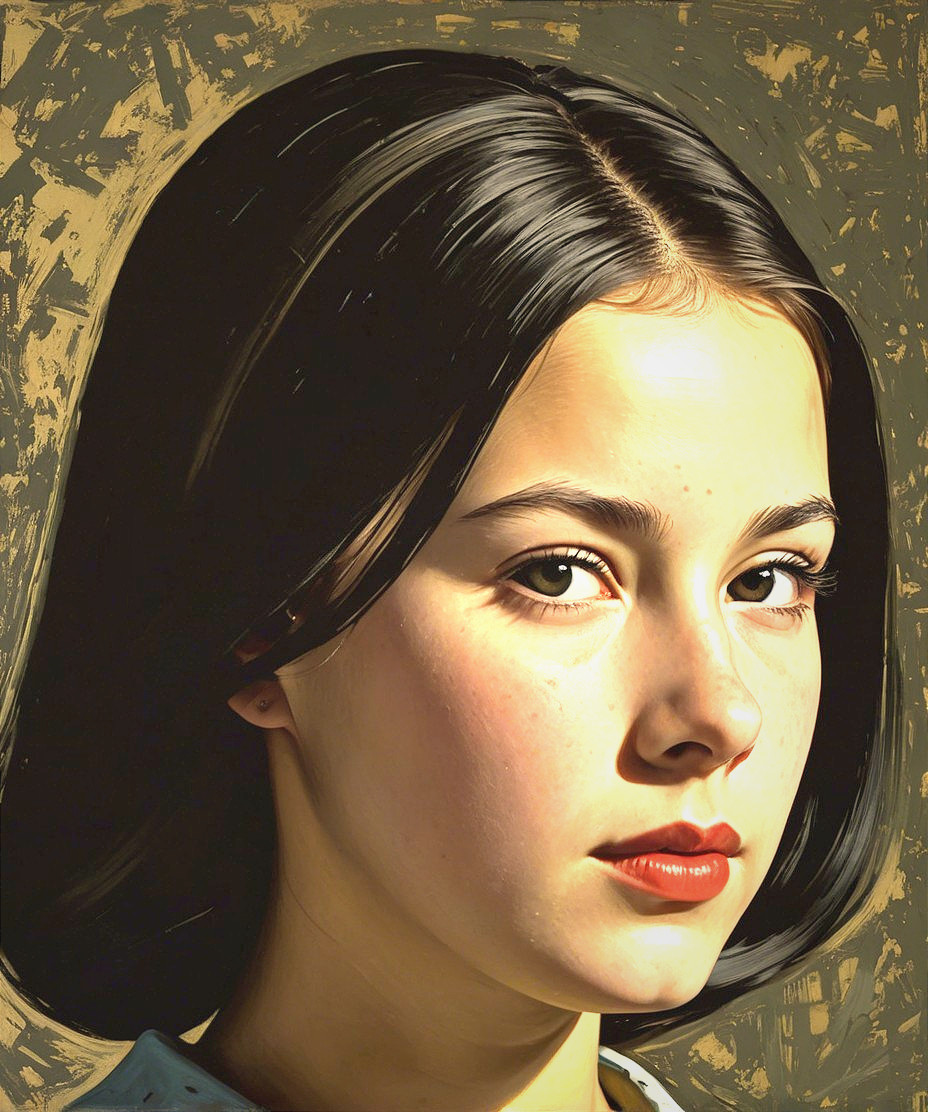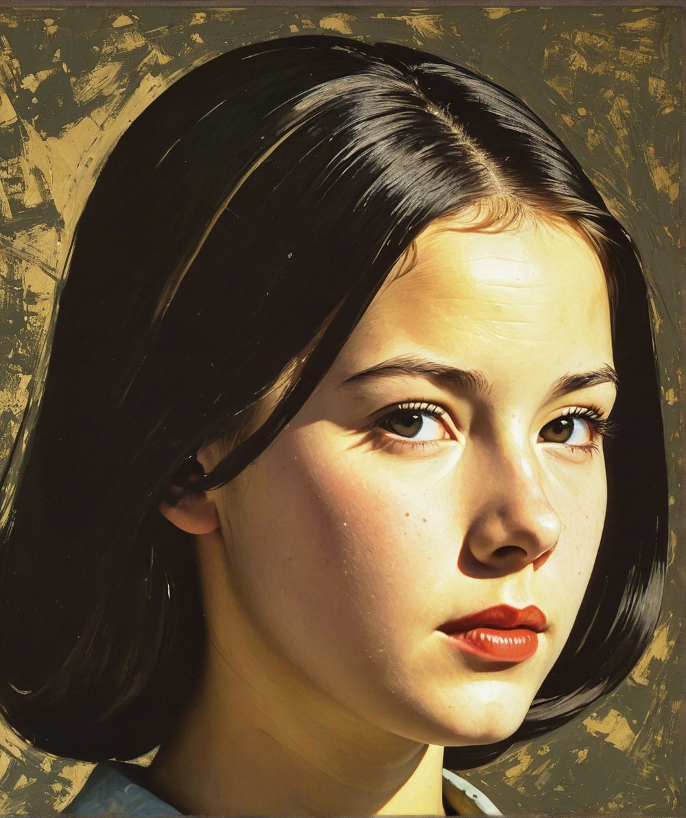 + Prompt:female juvenile portrait, 1950's pulp-art style, stylized headshot. Subtle minimalist design, smooth gradients, masterful use of hues by Ho Baron, serene zen lines, abstract brushstroke art, strikingly dramatic, iridescent color palette with a sheen effect, predominantly black tones with iridescent accents, digital artwork, sleek and elegant, sharp lines, high contrast, focus on texture, depth, and movement, Ho Baron's signature style,embodiment by Man Ray, linework, dots, flecks, gridded, gradient inking colors of metallic-honey and goldenrut-yellow, blotted and tesselated designs, accented with sepia colorsoverspray of watercolor with hues, lighting in style of Ho Baron and Overton Loyd, line-art features, tall and lean details, fiery, layered small stripes, perceptible gradients, painterly elements, glossy finish, HDR, reflections, rim lighting, parallax occlusion 1.3 inspired by Roy Lichtenstein and Man Ray, color glitch aesthetics, subsurface scattering 1.2, brightness 1.3, dof, debeh, bokeh, ambient occlusion 1.3, raytraced shadows 1.3, colourful surreal lineage forms, Magical realism, merged styles of John Buscema and Nam Yune Paik, dyed, nuanced painterly, simplistic outlines, warped, tall and lean details, modernism, complex coloring