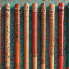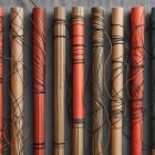 A collection of decorative rolls in various colors like orange, brown, and gray, elegantly wrapped with black string. Each roll features unique patterns, creatively arranged against a textured background.