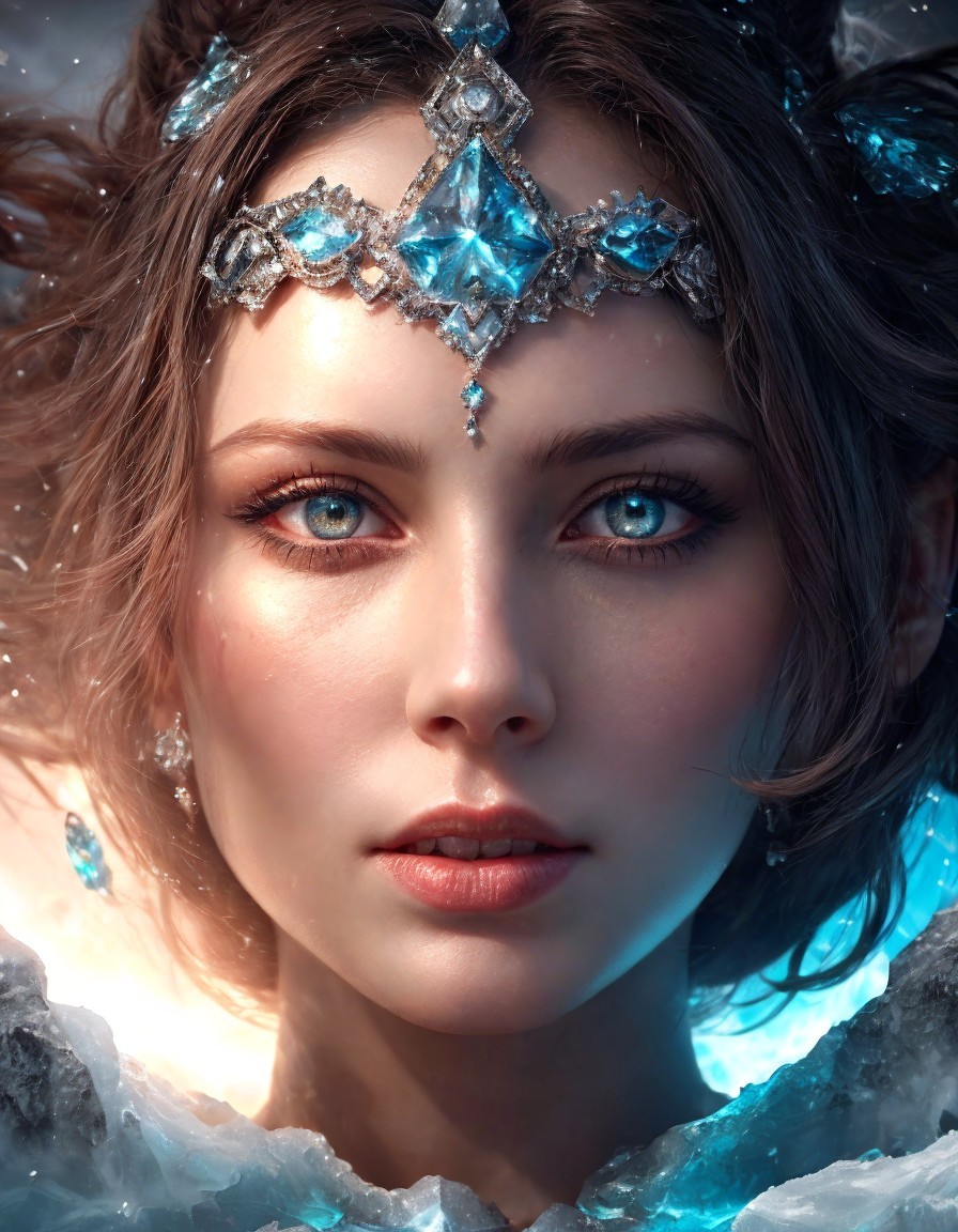 A woman with radiant blue eyes and a crystal tiara evoking an ethereal charm.