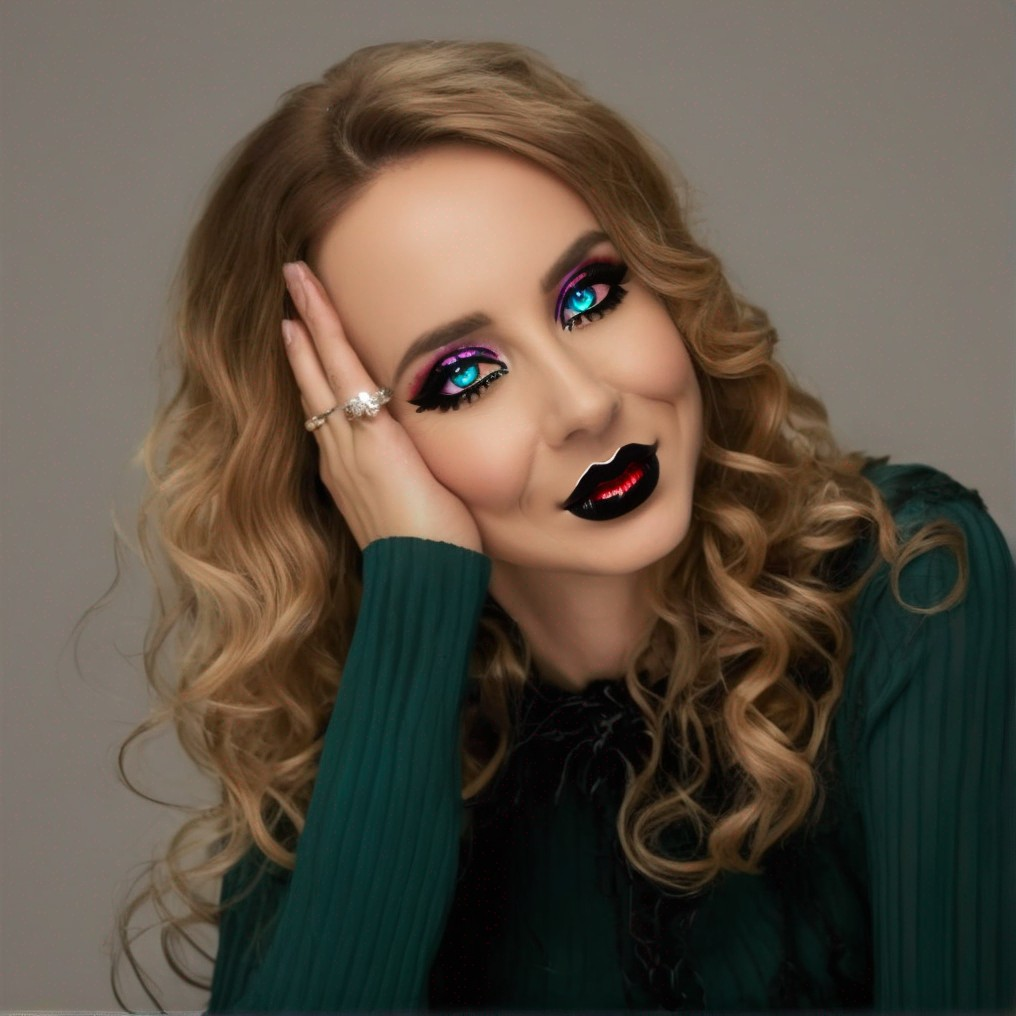 Curly-Haired Woman in Dramatic Makeup and Green Top Smiles