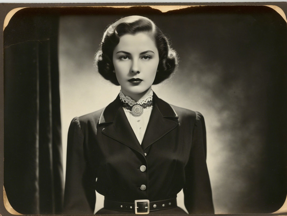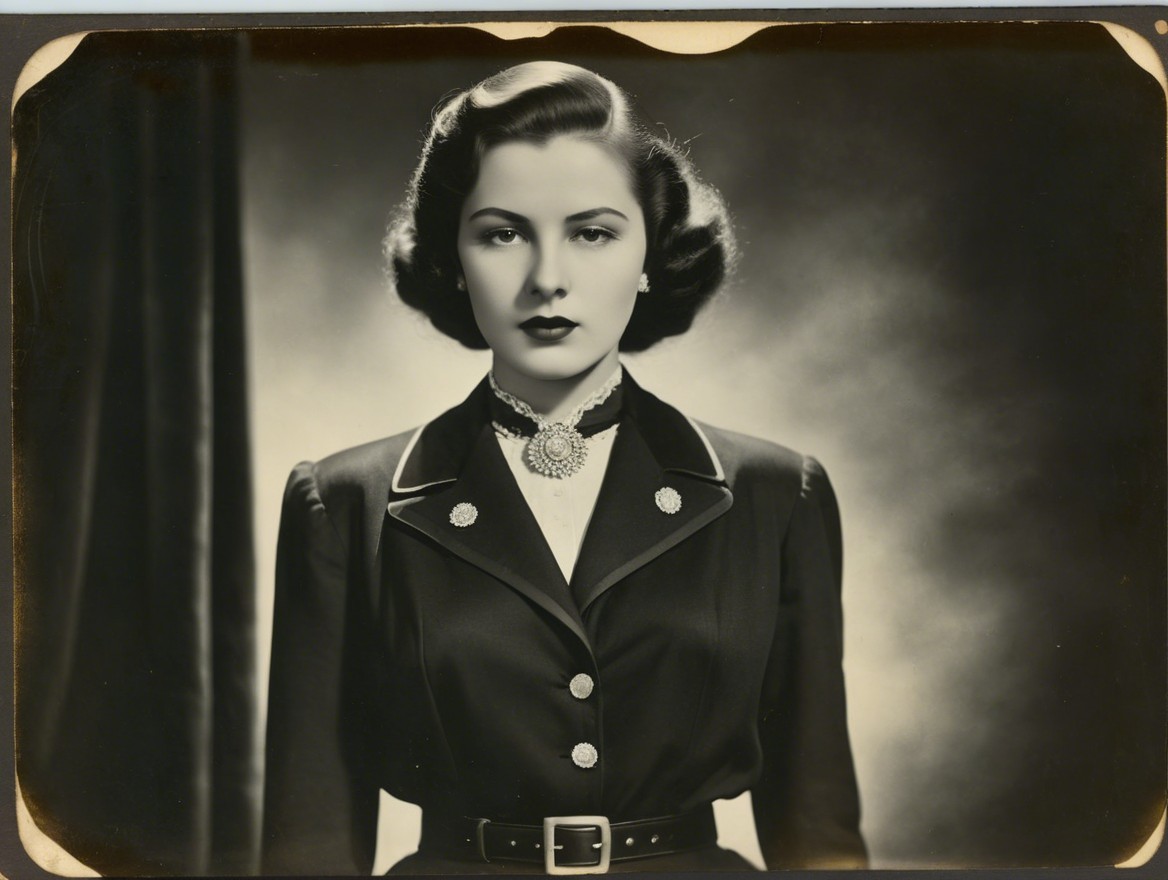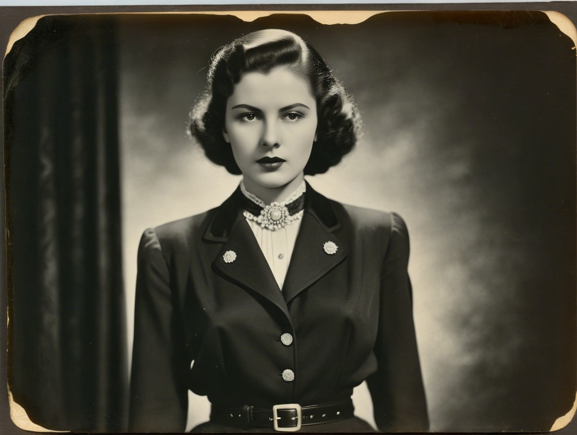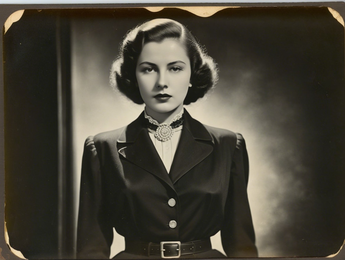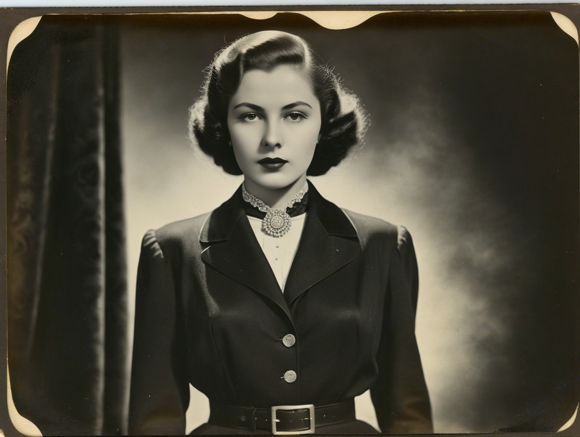 A black-and-white portrait of a poised woman with elegant waves in her hair, wearing a vintage suit and a delicate necklace, exuding classic 1940s glamour and sophistication.
