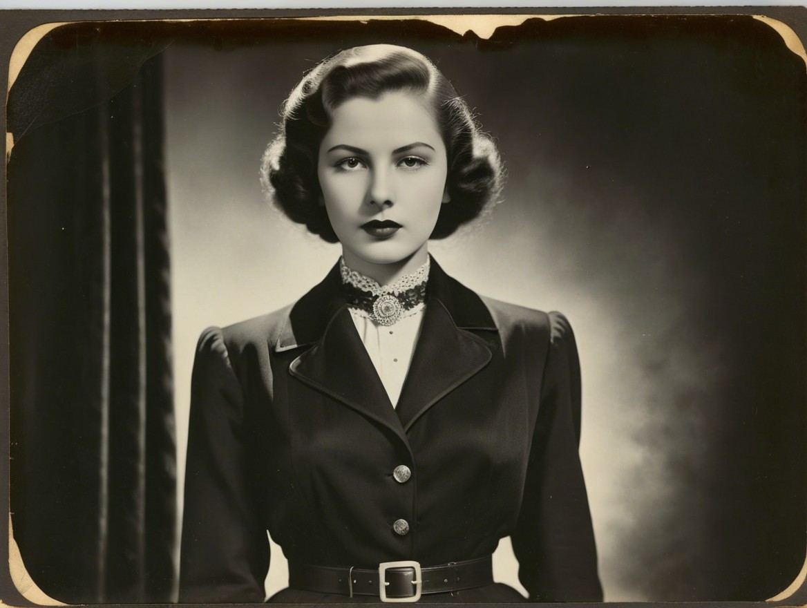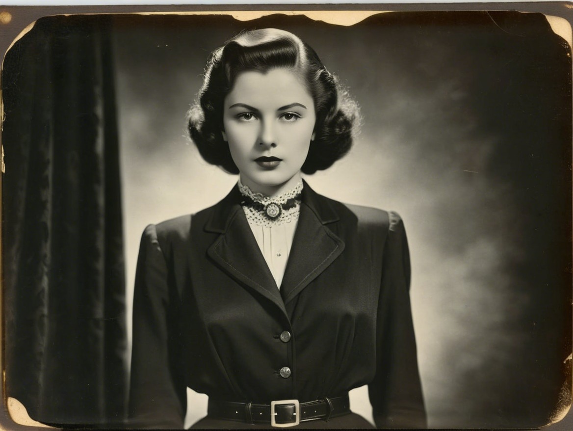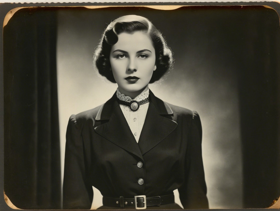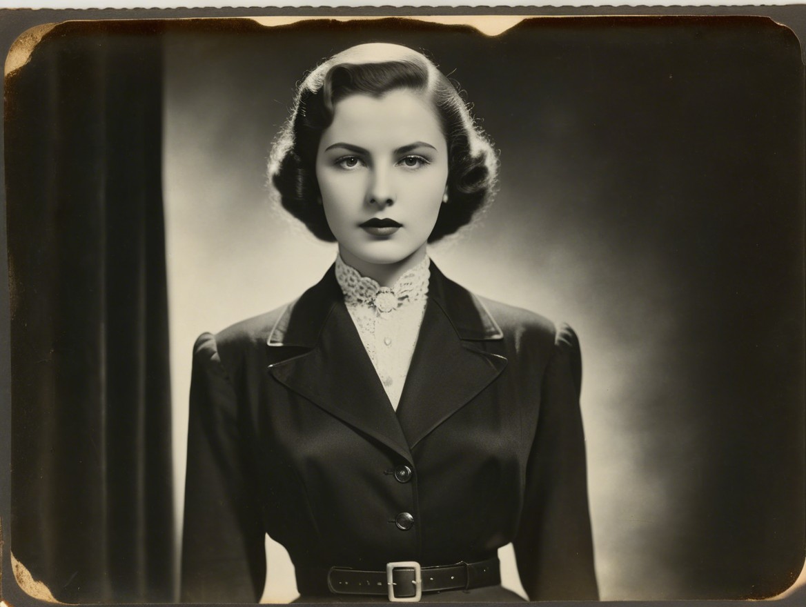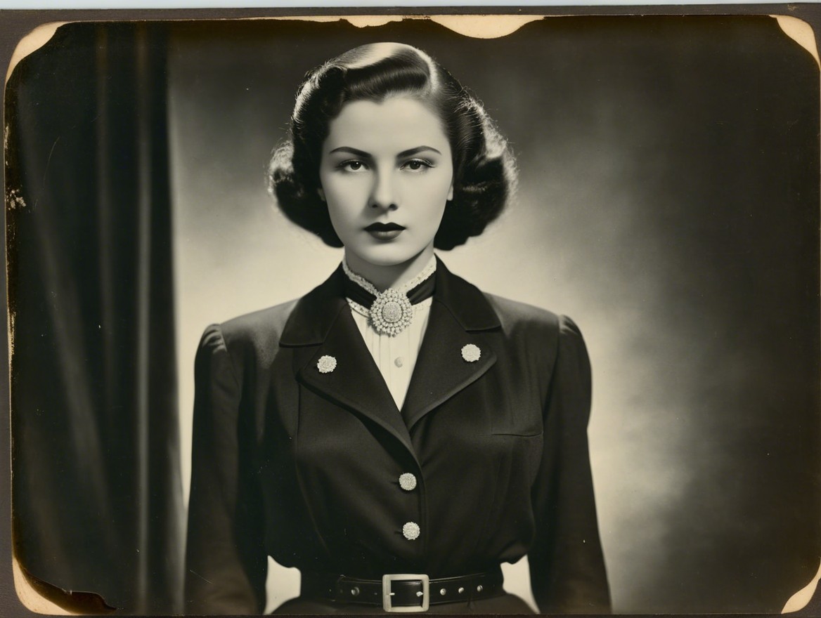 A black-and-white portrait of a poised woman with elegant waves in her hair, wearing a vintage suit and a delicate necklace, exuding classic 1940s glamour and sophistication.