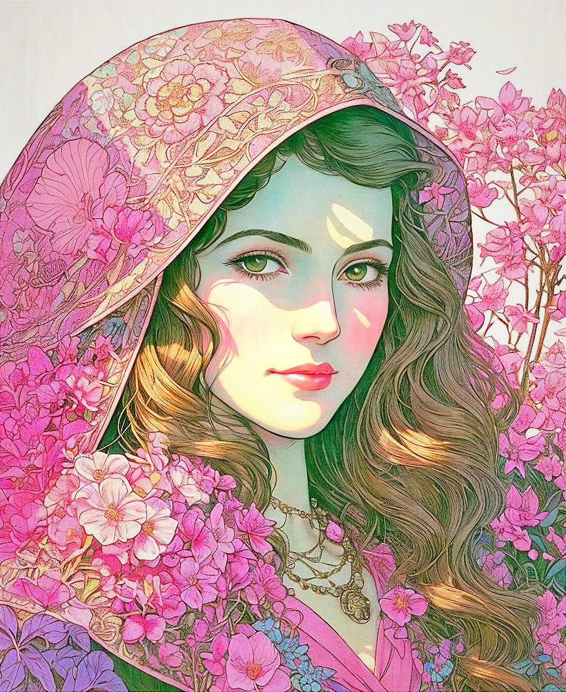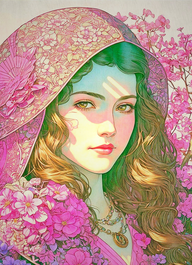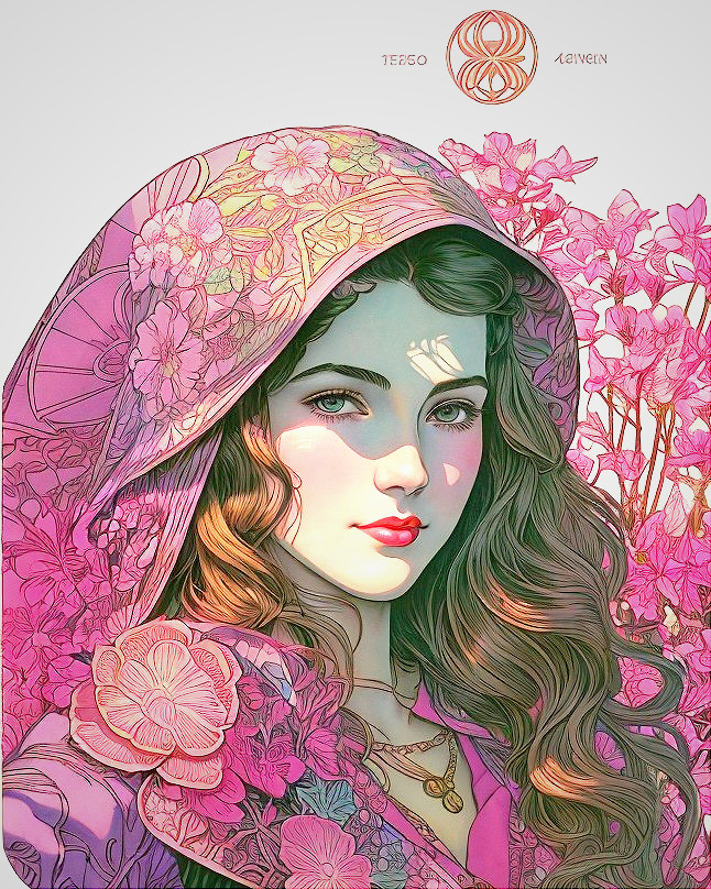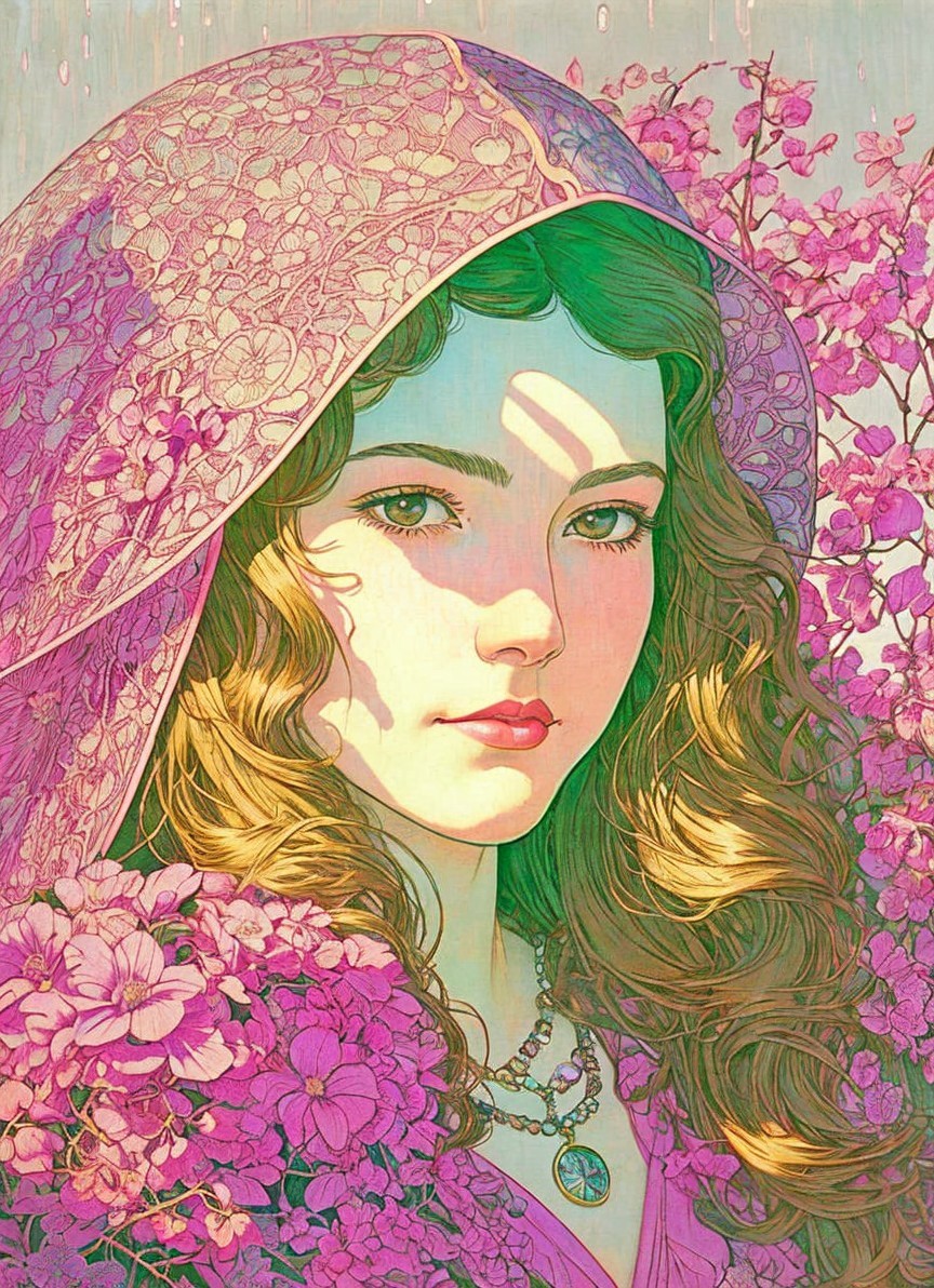 Prompt: Handsome teenage temptress with headscarf, close-up, woodblock print, colored line drawing, tiny lines, pastel colors, marvel comics art, styles of Georgia O'Keefe, Geof Darrow, harrison fisher, William Timlin, Leonora Carrington and Overton Loyd, Art Nouveau reminiscence, hippie look woman, garden, floralpatternon headscarf by Saturno Butto and Boris Vallejo, spring, mood, upper body portrait with stacked-up perspective, zentangle method, Animated marvel heroine with headscarf, stylized portraiture in gouache, grey to pink color palette, abstract style, watercolor and ink masterpiece by Richard Burlet, Susan Seddon Boulet, Julian Schnabel, Remedios Varo, overton Loyd, Jeannette Guichard-Bunel, Jean-Gabriel Domergue, detailed colored ink drawing, digital artwork, withered pale colors, intricately detailed in American Gothic style, stylized, dimmed dynamic lighting and wavery textures and hues, triadic color scheme of pink, ochre, and beige, vector 8:11, creating a mesmerizing inkpunk ambiance. The background is a dark ochre, ivid illumination,intricate details reminiscent of 1970s advertising art with cel-shaded motifs, all envisioned by Overton Loyd and Arlie Opal, raytraced shadows, 3D effects and delicate coloring. octane render, anisotropic filtering, shadow mapping in 1.7 ratio, and volumetric lighting. The overall aesthetic is reminiscent of book cover art on old paper, blending elements of pulp art, traumacore, and heartpunk. Tints of Stan lee and Remedios Varo, beautiful stylized lineage illustration, raytraced shadows 1.2, divisionism, radiance, linocut.