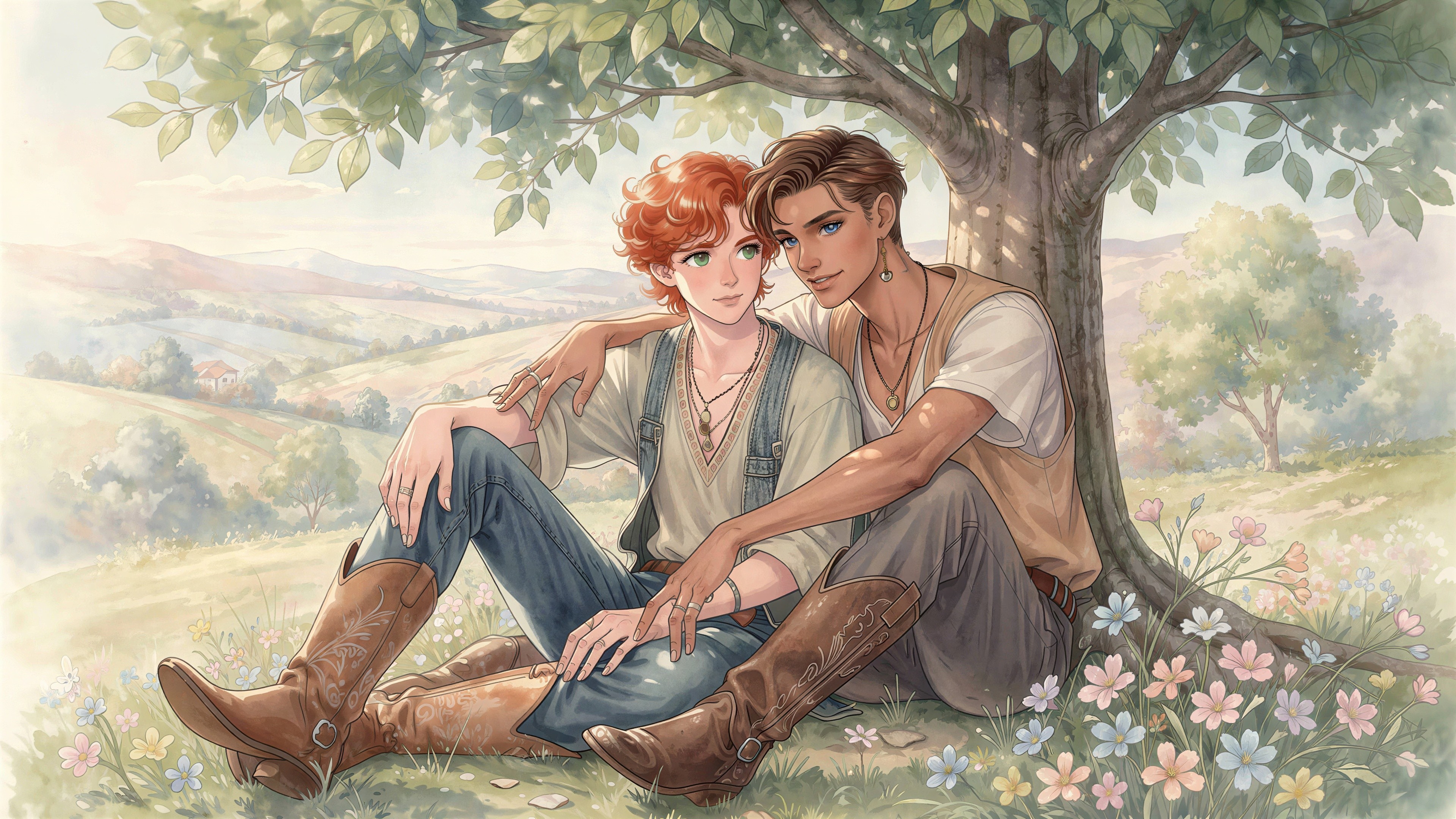 Two young men share a serene moment under a tree, adorned in Boho attire and cowboy boots. Their delicate features and graceful forms are captured in soft pastels and detailed watercolors, surrounded by flowers.
