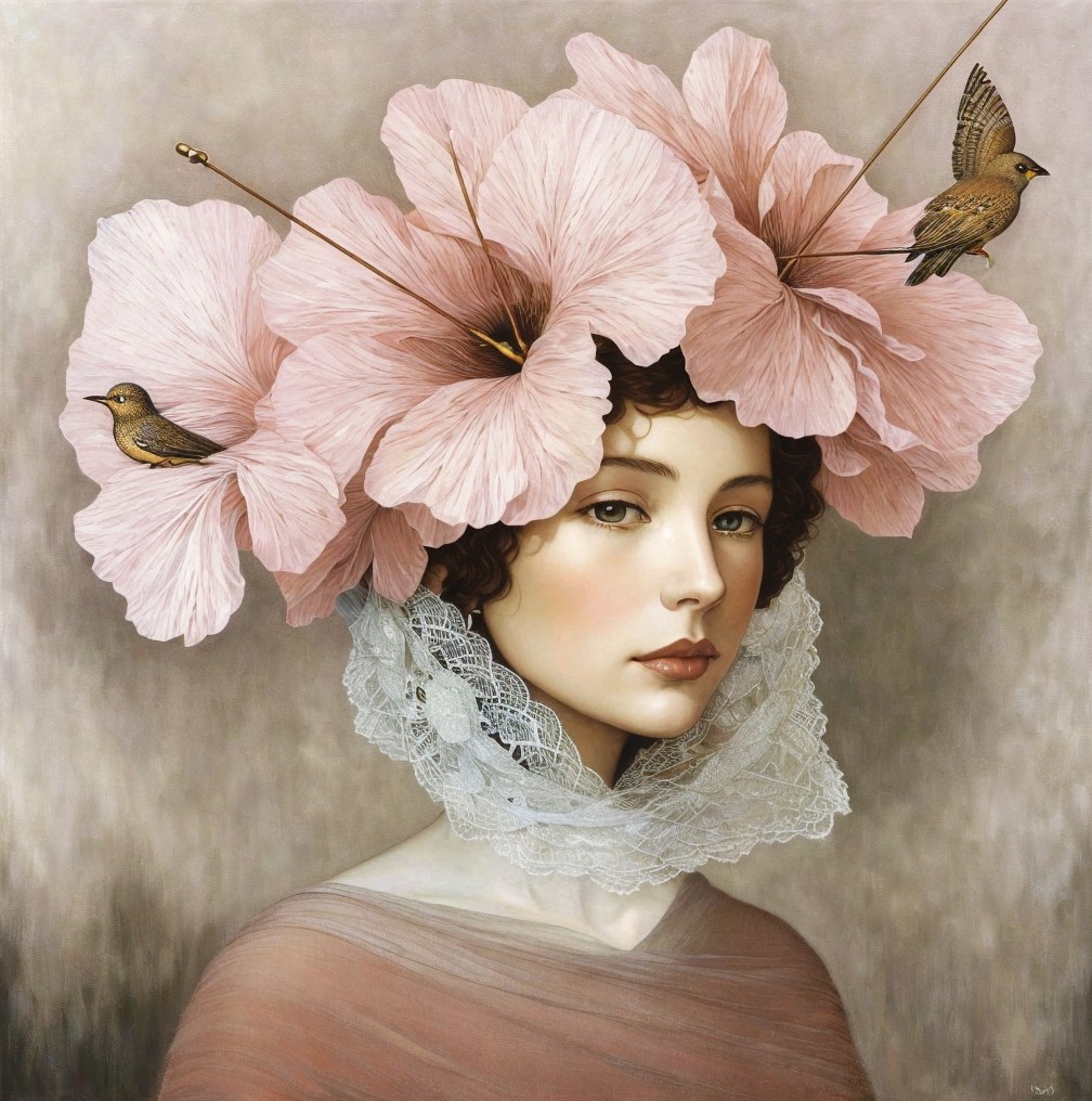 A serene woman wears an elaborate hat made of white feathers, featuring a dove perched atop. Her delicate features and lace collar create a whimsical, dreamlike atmosphere against a cloudy backdrop.