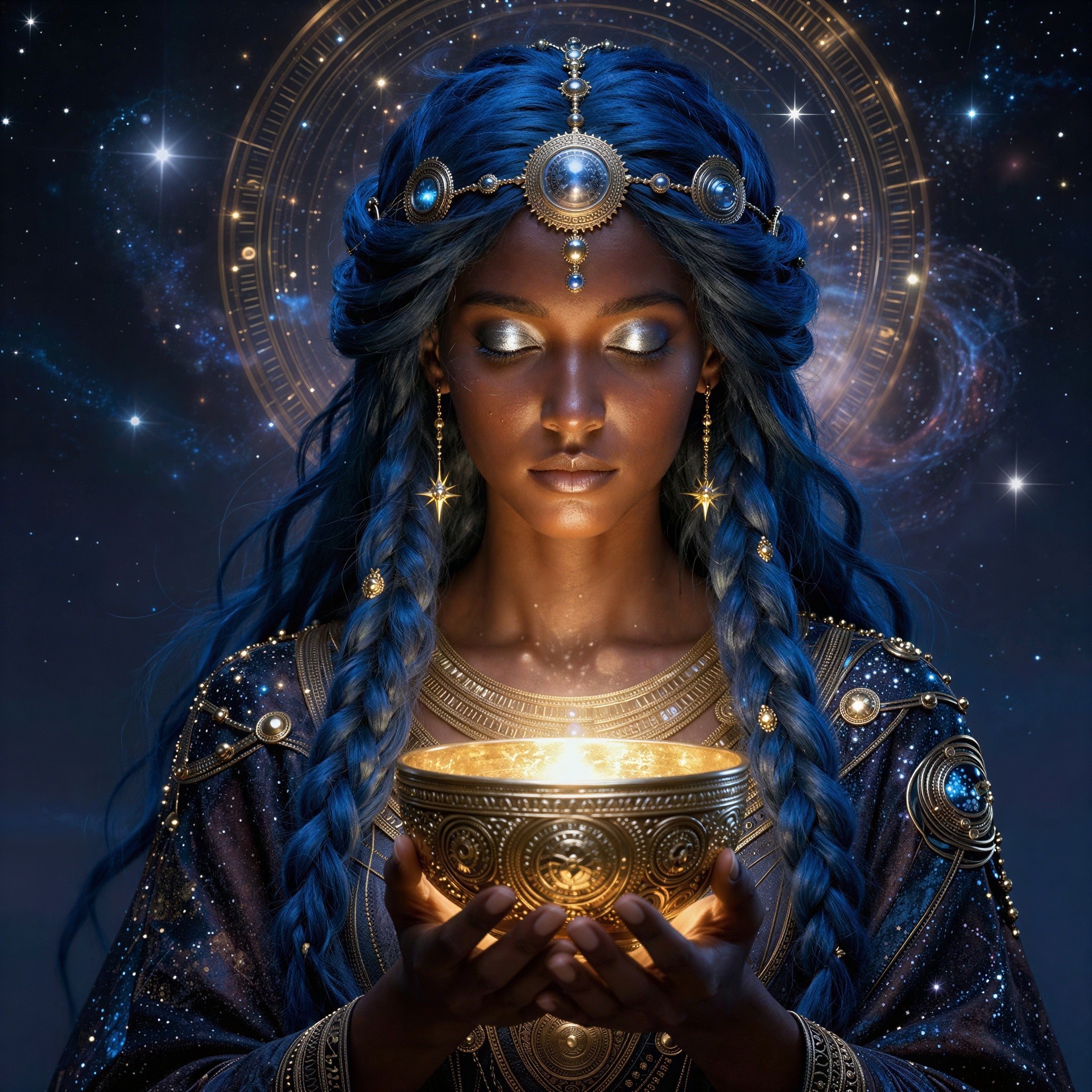 An ethereal and captivating image of a mystical figure embodying cosmic wisdom. The subject is a woman with a deep, rich skin tone, exuding an aura of serenity and strength. Her long, flowing hair is a dark blue, styled in intricate braids that cascade down her shoulders. She has a smooth, symmetrical face with almond-shaped eyes, closed in deep contemplation, reflecting hues of silver.