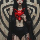 puzzle maze, optical illusion in the background, trippy, creepy goth Hmong girl holding a red and black bloody Japanese kabuki fox mask, very long black silky hair that reaches the floor, very big chest, Victorian goth, hallucinations, psychedelic, psychosis, eerie smile, unhinged, dripping paint, dripping ink, beautiful thick girl, thick thighs, vibrant red lips, cold large black eyes, thick curvy chubby cute volupotous body, big waist, big hips, long legs, expose skin, showing belly button, piercings, paint dripping from her other hand, flower lacey maze like patterns pantyhose stocking, model in a intricate abstract pose. The style is a hyperrealistic oil painting reminiscent of MC Escher, capturing every grimy detail of the spiraling decay of someone's mental health and the rebellious out of control spirit of the subject, dominant red and black lines in the composition